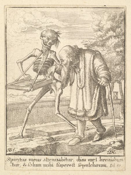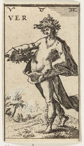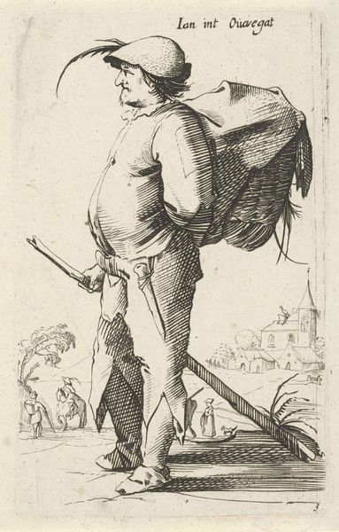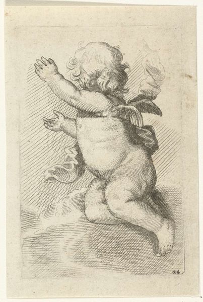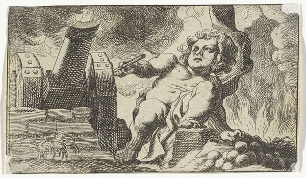 Editor: Here we have Georg Strauch's "Design for an Emblem with a Child Picking Flowers," created sometime between 1633 and 1675. It’s a drawing, almost like a little print. I'm immediately struck by the… strangeness, almost grotesqueness, of the child juxtaposed with the pastoral scene. What do you make of it? Curator: That perceived strangeness, that "grotesqueness," as you put it, I find quite captivating! The artist almost playfully juxtaposes the idealized innocence we associate with children with a somewhat unflattering, earthy realism. See how that chubby figure is actively *engaged* with nature. Not just a passive observer. To me, it whispers of a Baroque sensibility—a fascination with contrasts and the transience of beauty, wouldn't you say? What’s your sense of its place? Editor: Baroque makes sense. It's got that drama, even in such a small piece. But that child, the activity... is he symbolic somehow? Curator: Absolutely. Consider emblems, which were hugely popular then. These images with accompanying mottos were intended to teach moral lessons. Think of this little one plucking flowers – is he embracing life's fleeting joys, or foolishly grasping at something impermanent? The landscape suggests possibilities—perhaps a journey? What about the presence of the church in the distance? Editor: It sounds almost like a meditation on life and time, even in such a simple scene. Curator: Precisely. Perhaps it invites us to reflect on the choices we make and how we engage with the world. The garden, that emblem for fleeting life! A tiny drama in ink, ripe with meaning! It has been a pleasure.