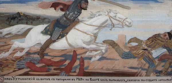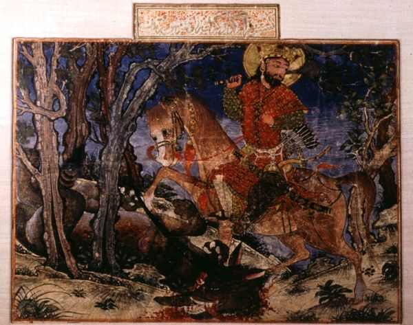 Editor: This is "Bahram Gur tramples Azadeh," painted by Ahmad Musa in 1336, using tempera, likely on a textile. It’s a small, intensely detailed painting depicting a hunting scene. There's a real sense of violence but also vibrant materiality to it. What stands out to you in this piece? Curator: I'm immediately drawn to the painting's grounding in material processes and their social implications. Consider the labor invested in creating the tempera itself, sourcing pigments perhaps from distant lands, or the weaving of the textile support. Then, the deliberate act of Ahmad Musa carefully grinding and mixing, an act inseparable from the final product. Do you think the labor echoes the themes in the narrative itself? Editor: That's a really interesting perspective. I hadn’t thought about the connection between the physical creation of the painting and its narrative content. I was more focused on the story being told. Curator: Exactly. The means of production reflect societal structures. Royal patronage dictated materials, style, and even subject. And we also see the economic power manifested in the detailed ornamentation of Bahram Gur's garments, showcasing access to finer materials, versus the tragic Azadeh trampled beneath his mount. This stark contrast, is in its way, a comment on class struggle. Editor: So, it's less about the story of Bahram Gur and Azadeh, and more about how the painting, in its very making, reveals a hierarchy and social order? The craft itself becomes a statement. Curator: Precisely! It compels us to examine how the elite commissioned artisans and deployed art as an active element of power dynamics and material control. We should never decouple consumption from creation when appreciating such works of art. Editor: That's fascinating. I'll definitely be thinking about the materials and the process behind the art a lot more. Curator: It reframes our understanding, doesn’t it? Looking at art as a result of labor, materials, and power, gives us a new lens to appreciate artistic intention and impact.