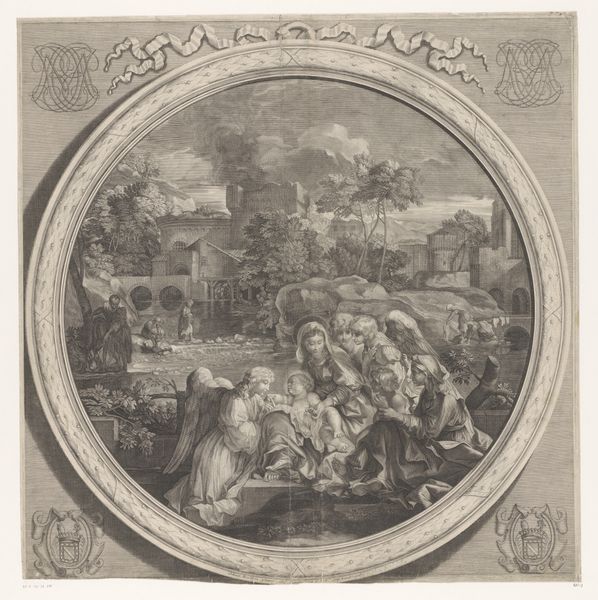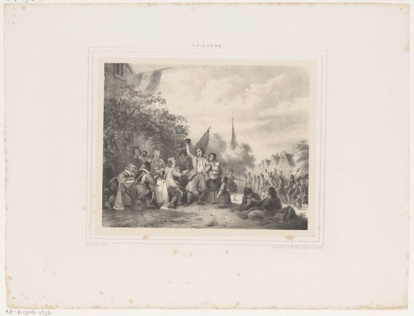 Jean-Baptiste Madou created this artwork of a woman reading to a group in a park using a printmaking technique. The print shows a scene framed by an ornate border, offering a glimpse into a world of leisure and intellectual engagement. Observe how the composition is carefully structured to guide the viewer's eye. The figures are arranged in a semi-circle, drawing attention to the woman reading, who acts as the focal point. Madou’s attention to light and shadow creates a sense of depth, emphasizing the verdant setting of the park. The print is more than just a visual representation; it invites us to consider the social dynamics and cultural values of the time. Reading was a communal activity, a means of sharing information and ideas. Madou captures a moment of intellectual exchange, suggesting a world where knowledge and leisure go hand in hand. The border around the scene serves to heighten the sense of looking into another world. Consider how the formal elements of the artwork – the arrangement of figures, the interplay of light and shadow, and the carefully detailed setting – all contribute to a broader understanding of the cultural and intellectual life that Madou sought to represent.