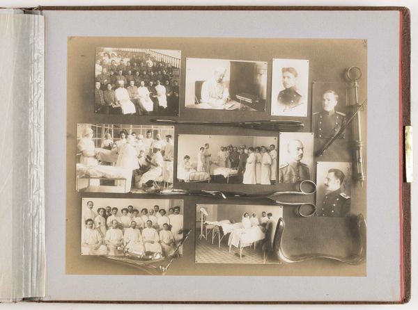 Editor: This is V. Sabel'skij's "Composition of twelve photos of persons and education at the Imperial Military Medical Academy, combined with a decoration of dried branches," created in 1913, using photography. It feels like looking into a bygone era, presented with this grid layout and decorative elements. What catches your eye when you look at it? Curator: The inherent tension between the rigid structure of the photographic grid and the organic, almost chaotic, placement of the dried branches presents a fascinating dichotomy. Consider the stark contrast in textures and forms—the smooth surfaces of the photographs against the rough, brittle feel one imagines when looking at the branches. Editor: So it's more about the visual relationships than the subjects? Curator: Precisely. Disregarding, for the moment, the historical or contextual narratives these photographs might imply, examine how Sabel'skij arranges these disparate elements. Note the strategic placement of the darker, denser clusters of branches around the lighter photographic squares. How does that interplay affect the overall composition, the flow of your eye across the surface? Editor: I see what you mean, it does frame certain images. Do you think that influences how we interpret those specific photos? Curator: Potentially, yet, I posit the composition itself, the arrangement of form and texture, stands alone as the primary mode of signification here. Do the branches serve a symbolic function, perhaps referencing mortality, given their withered state? Or, is their inclusion purely an aesthetic choice to disrupt the otherwise severe linearity of the piece? It seems a structural foil more than a symbolic key. Editor: That's a totally different way of seeing it! I was so caught up in trying to understand what the images represented, I hadn't focused on their formal relationship with the branches. Curator: Art often functions on multiple levels. Dissecting its components, as we've done here, reveals its internal logic, allowing for a richer appreciation of its aesthetic qualities. Editor: Thanks for highlighting that approach; it offers a new layer of understanding I can certainly take into my future study.