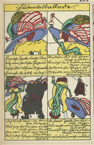 Editor: This color lithograph, "Plate from The Dreaming Youths," comes to us from Oskar Kokoschka, possibly created between 1907 and 1917. The figures appear to be in a dreamscape filled with evocative symbols. What do you see in this piece? Curator: The cultural memory here is fascinating. I see a clear connection to early 20th-century Expressionist anxieties – anxieties about the self, about relationships, about the changing world. Notice the juxtaposition of innocence and burgeoning sexuality, reflected in the stylized figures and the unsettling color palette. The text itself, bordering the image, acts as another layer of symbolic meaning, a fragmented narrative enhancing the dreamlike quality. Do you see how the water motif repeats, and what significance that might hold? Editor: I see it, the repeated water imagery! There's the pond, the figure immersed in it, and the mention of snow melting into a lake in the text. Water often represents the subconscious, right? Maybe Kokoschka is exploring themes of hidden desires or emotional turmoil? Curator: Precisely! And consider the figures themselves: are they Adam and Eve in a fallen Eden? Or perhaps representations of the artist’s own inner conflicts? Kokoschka was deeply influenced by the psychological theories emerging at the time. The stylized nature with unnaturalistic colors serves to heighten the tension of the central figures' interpersonal relationships. The composition itself becomes a psychological landscape. Editor: So the image isn't just a pretty picture, it's a window into the artist's mind and the cultural anxieties of the time. Curator: Exactly. And a reminder that images continue to accumulate and reflect new layers of meaning across generations. It’s a complex dialogue between the artist, the cultural context, and the viewer. Editor: It’s interesting how the combination of art and text conveys such deep cultural meaning and memory. Thanks, that was incredibly insightful!
