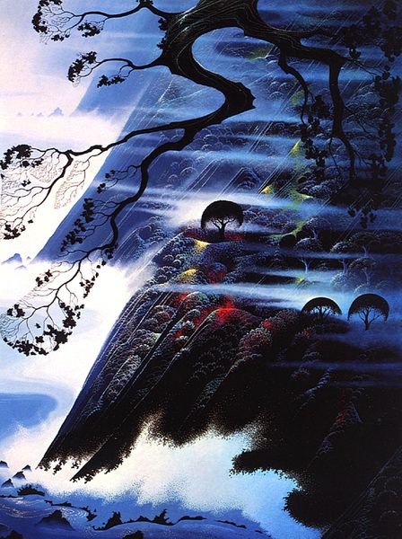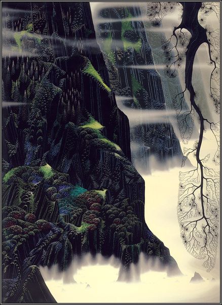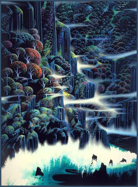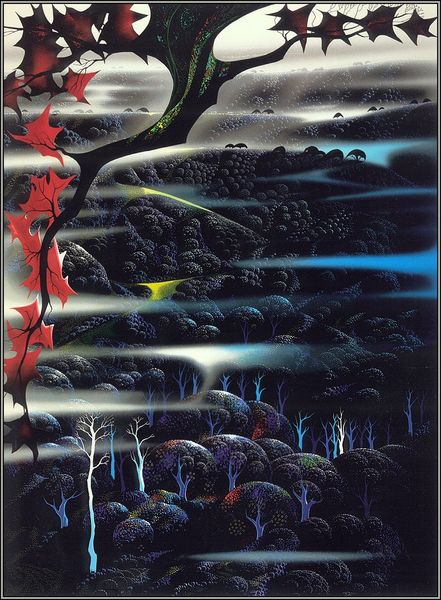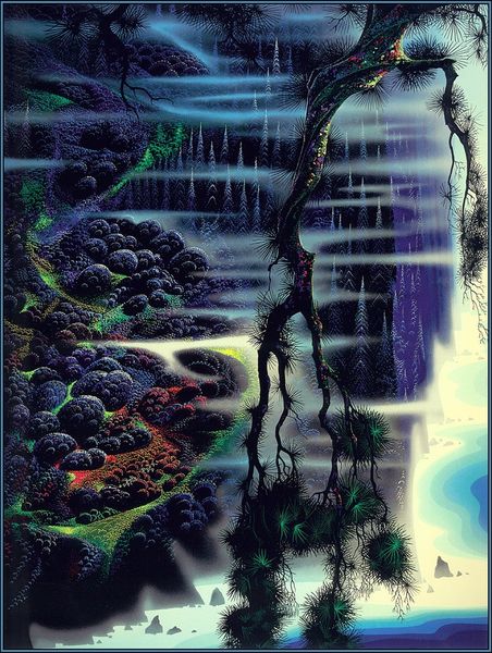 Eyvind Earle made this landscape, A Vagrant Dream, with what seems like smooth, almost airbrushed color gradients. It's so stylized, like something dreamt up while half asleep. Look at how Earle uses color to create depth - the way the green almost glows against the dark blues and blacks, making the scene feel both inviting and mysterious. His lines are so sharp, and everything is carefully placed. It feels like a fantasy world, but one grounded in the real textures of forests and mountains. There's this cascading waterfall of fog or light that divides the composition. Notice the way the spindly tree on the left mirrors the sharper trees within the valley, connecting the foreground to the background. Earle worked as a background artist for Disney, and you can see that influence here, this sense of unreal perfection, but also maybe a touch of Edward Hopper's stark, dreamlike landscapes. It's all about mood and atmosphere, a feeling more than a place.
