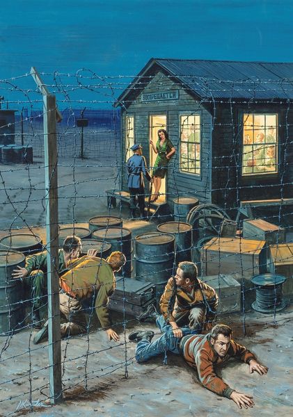 Curator: Well, this is intense. It's giving me flashbacks to… let's just say certain graphic novels I wasn’t allowed to read as a kid. Editor: Indeed. This captivating artwork by Victor Prezio, crafted in 1962 using oil paints, is entitled "Where Sin is the Only Law". It’s quite a stark piece of storytelling. What immediate impressions do you get? Curator: Oppression, obviously. The women’s postures, the leering faces… it's unsettling. I am curious: Why "sin"? It feels very loaded. It also evokes pulp magazines. Do you feel that the title reflects the obvious exploitation depicted or attempts some kind of justification? Editor: "Sin" can be such a culturally relative term, can't it? And the visual vocabulary certainly leans into established tropes of the “exotic” and the “forbidden,” weaponized in this moment. I’m struck by the visual tension created by the artist juxtaposing those suggestive elements against the bleak reality. Curator: So, is Prezio offering us a critique, or simply titillation disguised as a moral fable? The line feels very blurred, especially given the composition. Editor: Well, look at the recurring motifs – the straw hut representing "otherness", for instance, repeated as we consider different cultures in contrast to ours. And notice how the military garb itself transforms into a signifier of power and control within a given visual framework. Even something like the colors being mostly washed-out hues contrasted with bursts of suggestive skin, it accentuates feelings of unease. Curator: It feels exploitative but definitely memorable; those colours draw you in. Are the symbols almost *too* obvious? I can’t decide if it diminishes the artistic impact, or is a stroke of pure illustrative genius? Editor: Perhaps it is less about subtlety and more about conveying a primal narrative of power, domination, and victimhood in very accessible visual terms? That bold choice gives it such enduring force – however disturbing that may be. Curator: You know, you’re right. The forcefulness – and yes, the discomfort – probably makes us confront these uncomfortable historical and societal themes head-on. And art that sparks such necessary and even awkward dialogues definitely makes its mark. Editor: I agree entirely. It's this potent combination of narrative symbolism and impactful visual storytelling that gives this work its undeniable gravity.