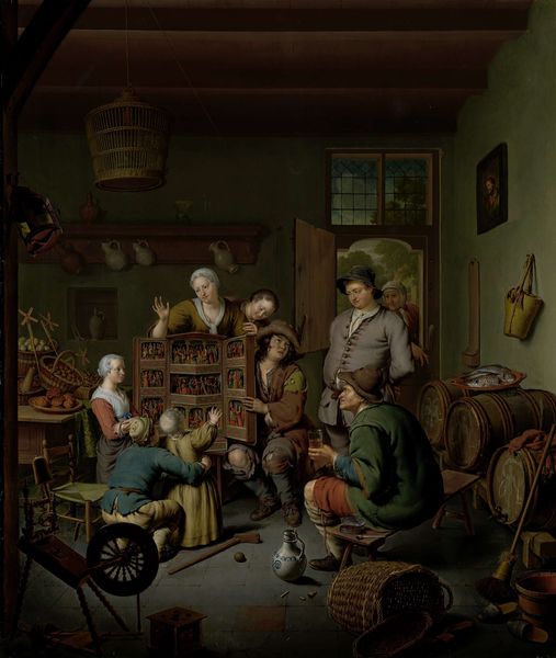 Johannes Jelgerhuis painted 'The Distillery of Apothecary A. d'Ailly' using oil on panel, but the exact date of its creation remains unknown. Jelgerhuis, who lived through the late 18th and early 19th centuries, was working in a time of significant social and political change, including the rise of industrialization and shifts in medical practices. The painting offers us a glimpse into the apothecary’s world; a space where science, commerce, and daily life intersect. We see a male figure carefully pouring liquid, suggesting a controlled and precise practice, while another man looks on. The setting, filled with various tools and containers, evokes a sense of both knowledge and labor. How might their identities – their roles, social standing, and the expectations placed upon them – shape their experiences and interactions within this space? Consider the emotional atmosphere of this distillery. Is it a place of healing, of business, or perhaps a combination of both? Jelgerhuis invites us to reflect on the complex relationships between individuals, their work, and the broader society in which they live.