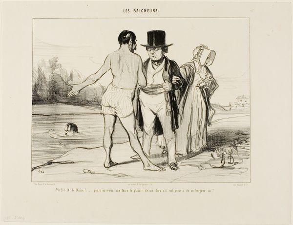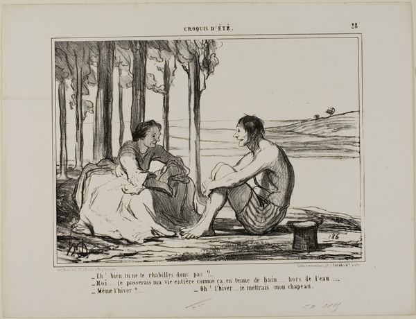 This lithograph, "An Interesting and Refreshing Reading," was created by Honoré Daumier. Here, we see a man engrossed in a newspaper, while a woman sits beside him, both with their feet dipped in water. The act of reading itself carries symbolic weight. Throughout history, the consumption of texts has been seen as a marker of intellect and status. Yet, Daumier presents a twist: the man is not in a library, but in a pastoral scene, feet dangling in the water. This juxtaposition invites us to consider the evolving role of knowledge and leisure. Consider how the motif of immersion, seen here in the water, recurs in baptismal imagery across cultures, symbolizing purification and renewal. Daumier cleverly uses the water to suggest not just physical refreshment, but also a kind of cleansing from the burdens of daily life, albeit with a touch of ironic humor. The emotional resonance lies in the viewer's own yearning for escape and intellectual stimulation. This scene evokes our primal connection to water and the allure of knowledge, a timeless cycle of human experience.