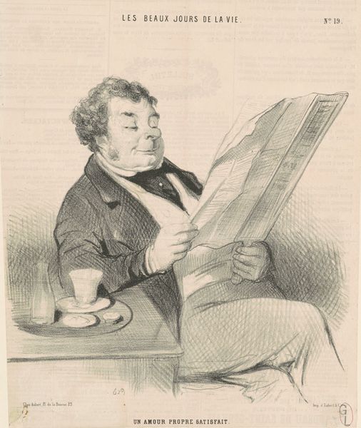 Editor: This is "Le Perruquier du Faubourg" by Honoré Daumier, from around the 19th century. It's a print, and it feels almost like a quick character study. I'm particularly struck by the artist's use of line to convey the barber's, let's say, unique personality. What do you see in this piece? Curator: The lithograph, as a work of art, employs line and form to create a compelling image. Notice how the hatching creates a dynamic surface—darker in areas that convey volume and depth, lighter to suggest the plane advancing toward us. The formal relationship between the barber, his bowl, and the background is masterfully done. Editor: I'm drawn to the way the lines emphasize his facial features, almost to the point of caricature. Is that intentional, or is it simply a stylistic choice? Curator: Consider how the emphasis on specific features through line weight serves to underscore particular aspects of his character. The strong contrast accentuates not just his physical appearance, but also, arguably, something of his nature. Does it not reveal his personality? Is the work's essence dependent on the specific content of the caricature, or its visual components? Editor: That's a really helpful way to look at it, to really consider the components! Focusing on the form lets us appreciate how skillfully Daumier is communicating character and status with very simple lines and shading. Thanks! Curator: Indeed. Sometimes, a strict focus on the aesthetic components unveils greater artistry than merely dissecting symbolism ever could.