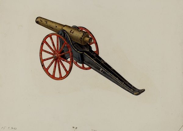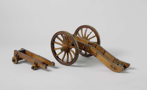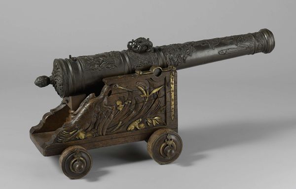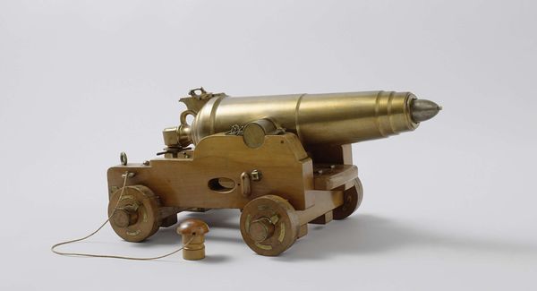Curator: At first glance, this miniature cannon is almost quaint, isn't it? So finely wrought in bronze and wood, dating back to the late 16th century, attributed to Germain Pilon... like a child's toy from a particularly intense royal family. Editor: Toy, yes, but for children steeped in power, constantly aware of conquest and defense. It’s fascinating to see war rendered at this scale, both diminishing and, somehow, magnifying its impact. Curator: Magnifying is an interesting word choice. The sheer detail is astonishing, though; the floral patterning chased into the bronze, the texture of the wood... it's like the artisan was wrestling with something beyond mere replication. Almost obsessive, really. Do you get that? Editor: Absolutely. Think of the Renaissance courts—obsessed with not just warfare itself, but also with representing it, controlling its narrative. These miniature cannons acted as status symbols but were used also in demonstrations or perhaps to illustrate new theories of artillery... These beautiful and ornate weapons carried real sociopolitical implications. Curator: Good point. Like the Instagram posts of its day, maybe. Still, you’d think all that power would express itself through some larger canvas. I feel like these small scale objects somehow contain so much repressed angst. It almost tickles. Editor: And the craftsmanship! Think about the laborers—their exploitation was crucial to the creation of weapons then just like today. Understanding historical oppression is vital in considering Pilon’s process and the product of his efforts. The violence it represents ripples across time. Curator: Well said. Perhaps the act of miniature making is also some acknowledgement of limitations; reducing the chaos of war to something beautiful, controllable and manageable. Editor: Beautiful but terrible, a microcosm that encapsulates entire worlds. These details offer so much and so much must also be imagined. Curator: Perhaps the power of art lies precisely in its capacity to transform what’s ugly into something deeply considered.