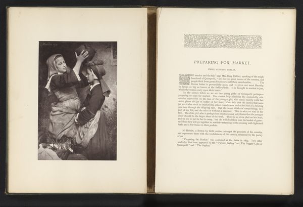 Editor: This is a photo reproduction of an illustration for Oliver Goldsmith’s *The Vicar of Wakefield* by Thomas Stothard, dating from before 1880. It’s an etching, lithograph and engraving on paper, and what immediately strikes me is the melodramatic scene. Everyone is so theatrical. How do you interpret this work in its historical context? Curator: Given that this is a reproduction, its reception becomes a really interesting point of entry. Consider the rise of illustrated books in the 19th century. They democratized art and literature, making them accessible to a wider audience. This image, reproduced and distributed, plays a part in shaping how the public understood Goldsmith's novel, doesn't it? What kind of visual shorthand is at work here, and how did it influence societal values through narrative? Editor: So, this image isn’t just about the novel itself, but about the wider culture surrounding it, how stories and values were circulated? The melodrama, for instance, emphasizes specific emotional responses that become normalized. Curator: Exactly! Think about the composition, the clear delineation between the figures. It invites viewers to take sides, to align themselves with certain characters and their moral positions. Who benefits from such clear narratives? How do they reinforce social hierarchies or expectations of behavior? And, how does Romanticism play a role in creating and influencing such strong imagery? Editor: I see how the image functions as a kind of propaganda, reinforcing certain ideals within the expanding readership of the 19th century. It makes me think about the power of images to not just reflect but shape society's beliefs. Curator: Precisely. The printing press and other innovations are really instrumental for that widespread influence and effect on society. This work invites us to examine how these kinds of narratives, visually presented, contributed to shaping Victorian moral and social landscapes. It’s quite thought-provoking.