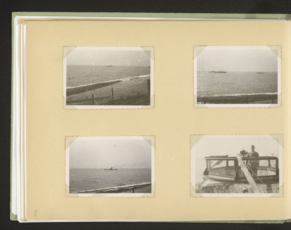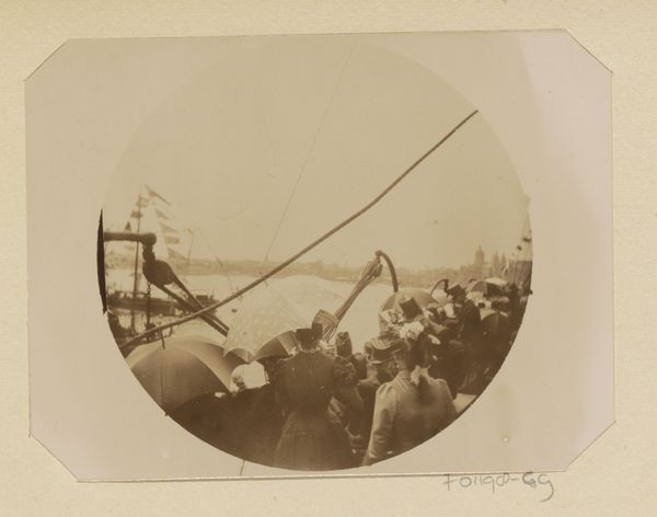 This photograph, "Dek van de boot tussen Vlissingen en Queensborough," was taken by Henry Pauw van Wieldrecht. The sepia tones and small scale evoke a sense of intimacy and nostalgia. The composition is structured by horizontal lines of the boat deck and the overhead structures. These lines create a sense of enclosure, framing the figures within a defined space. Notice how the arrangement of objects and people on the deck—the tables, the passengers, and ship fittings—forms a complex interplay of shapes. This disrupts any clear focal point, challenging traditional notions of perspective and depth. The muted tones contribute to an overall flattening of the image, emphasizing the surface and texture of the photographic print. The photograph functions as a sign, pointing not only to a specific moment in time but also to broader cultural codes around travel and representation. Its formal qualities—the lines, tones, and arrangements—invite us to consider the photograph itself as a constructed image, rather than a transparent window onto reality.