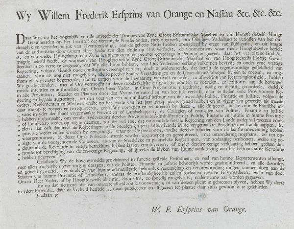 This is a proclamation from 1799 by Willem Frederik, the hereditary prince of Orange, made during the British-Russian invasion of the Netherlands. The visual experience is dominated by the density of the text, tightly packed lines conveying a sense of urgency and historical weight. The structure of the proclamation is inherently hierarchical. The large, bold typeface announcing its purpose, "To the People of the Netherlands," immediately asserts authority. The careful arrangement of the text, with its formal language, emphasizes the proclamation's official nature. It creates meaning through its very form, mirroring the socio-political structures it seeks to reinforce. The black ink on off-white paper provides a stark contrast, enhancing readability while also evoking a sense of historical gravitas. This use of color and form aligns with the broader artistic concerns of the time. The visual rhetoric works to legitimize and propagate a specific ideological position, revealing how power is asserted through symbolic means. The text invites ongoing interpretation, reflective of the complex power dynamics it seeks to address.