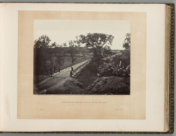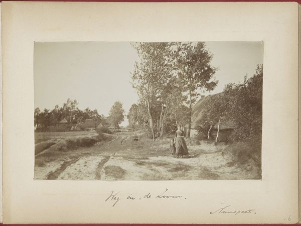Curator: This gelatin-silver print, taken circa 1890-1900 by Heinrich Ernst & Co., is titled "Europeans posing by a felled tree during the construction of a road through the jungle in Redangei, Sumatra". It’s currently held here at the Rijksmuseum. What are your first thoughts? Editor: A feeling of disruption, certainly. That sharp, barren road cut violently through the thick jungle. The Europeans in their pristine white attire look so out of place, a symbol of forced order on nature’s chaos. Curator: Precisely. The composition reveals so much about colonial impact. Note how the felled tree acts as a visual barrier, highlighting the labor involved in extracting resources and imposing infrastructure. The print material itself—gelatin silver—indicates industrial processes reshaping artistic production as well. Editor: I’m struck by the felled tree in that context – the toppling of what I can only imagine the Sumatran’s might see as sacred, representative of natural stability. It creates a deep tension between the visual ideals of "progress" and the loss of cultural significance tied to that natural world. Curator: Exactly! The photographic medium itself contributes to this dynamic. Mass production and distribution made images like these powerful tools for shaping public perception and justifying colonial expansion. Who holds the camera, directs the composition, owns the means to make meaning from what is shown here. Editor: And the figures posing! It reinforces that visual propaganda – a self-congratulatory assertion of dominance, that echoes the narratives around empire and civilization, even in such a simple composition. This photograph as more than a document, is the Europeans idea of victory. Curator: Well put! I see now how both the concrete road and the ethereal photograph participate in shaping colonial authority. Thank you. Editor: Thank you, those thoughts on materiality give me so much more context to read the cultural elements from.