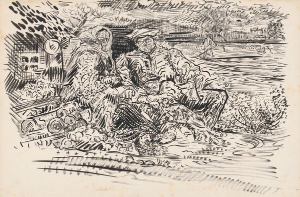 Hryhorii Havrylenko made this illustration for Mikhail Stelmakh's book "In the Hedgehog's Windmill," using ink on paper. This combination of materials and processes, though traditional, is far from neutral. Ink drawings like this one were crucial to the mass production of books. They are easily reproduced and allow for the combination of image and text, fostering a sense of shared cultural identity in an age of print. Here, the artist's hand is evident in the texture of the lines, which vary in thickness and direction to create a sense of depth and movement. Look closely, and you'll notice the way the lines suggest volume and shadow, giving the figures a palpable presence. The act of drawing itself is inherently linked to labor, politics, and consumption. Every stroke of the pen represents a conscious decision, a deliberate act of creation. By understanding the material properties of ink and paper, and the skilled labor required to produce this image, we can begin to appreciate the full meaning of Havrylenko's illustration. It blurs the lines between fine art and craft, reminding us of the importance of making in shaping our cultural landscape.