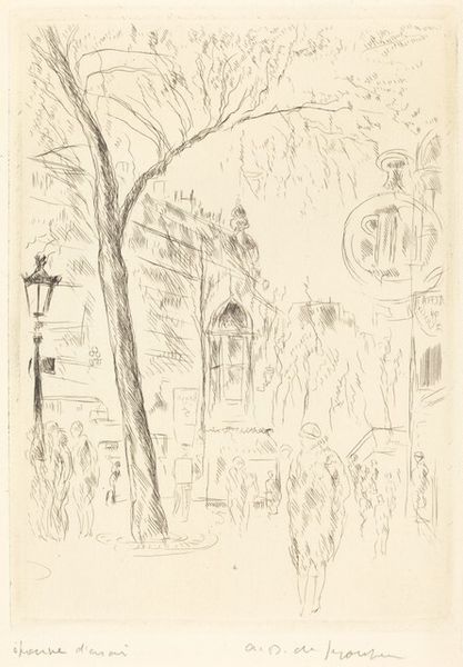 Editor: So, this is André Dunoyer de Segonzac’s 1924 etching, "Statue in the Trees, Versailles." I’m struck by the starkness of the lines. The trees almost feel like bars enclosing this little structure in the center. What do you see in it? Curator: The framing, for sure. This piece, ostensibly about a picturesque garden, reads quite differently when viewed through a critical lens. Versailles itself embodies constructed power; a landscape designed to reinforce absolute authority. How might Segonzac's artistic choice – the density of the lines, that sense of confinement – reflect anxieties around established hierarchies in the interwar period? Does it resonate with broader feelings of disillusionment after the trauma of World War I, perhaps a critique of the opulence and privilege the Palace represented? Editor: I never thought about it that way. I was focused on the visual contrast between the open, sketchy areas and the denser, darker parts of the foliage. It felt almost purely aesthetic. Curator: And it *is* aesthetic. But consider the social history interwoven with landscape art. Think about who had access to these spaces, who controlled the narratives surrounding them. The statue becomes less a celebration of beauty and more a marker of control within a meticulously sculpted environment. Do you notice the absence of people? Who *isn't* in this picture? Editor: Now that you point that out, it definitely shifts my understanding. It makes the solitude feel… deliberate. It's a space curated for some and explicitly excluding others. Curator: Precisely! Art doesn't exist in a vacuum. By analyzing the context – the social, political, and economic forces at play – we uncover the powerful, often unspoken messages embedded within. What will you take away from that? Editor: I'll definitely pay closer attention to how social history affects even the seemingly simplest subjects of art. There is a hidden meaning there. Thank you.