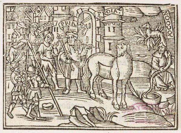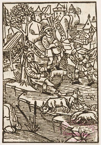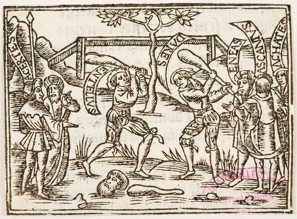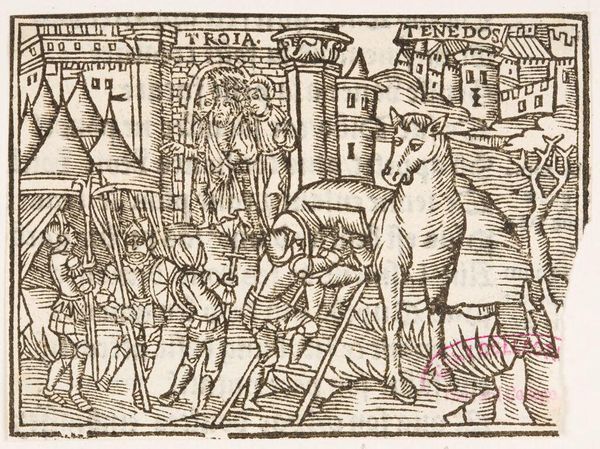 Curator: This image, titled "Illustration XLV", is an intriguing piece from an anonymous artist. Editor: It feels like chaos barely contained. So much movement, so much… fleeing. What’s happening? Curator: I see Eneas there, according to the banner held above him. And that banner by the other figure suggests it's Helen. It appears to depict a scene of escape, perhaps a key moment from classical literature? Editor: Those figures riding the bulls, though! The bulls are practically swimming in a sea of frantic lines. It’s like the artist translated panic into pure visual energy. But it works, doesn't it? Like a raw nerve laid bare. Curator: It speaks to the urgency of the moment. I find myself contemplating the stories these symbols evoke, those echoes of cultural memory that images like this hold, even across centuries. Editor: Exactly! It's a simple image, but it holds so much frantic storytelling. It makes you wonder about the stories we'll leave behind.