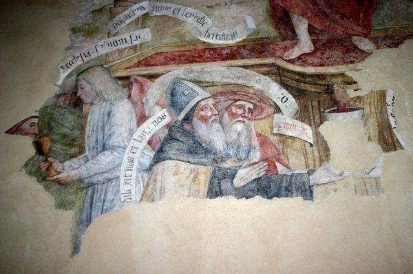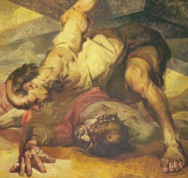 Curator: Here we see "The Franciscans," a 1926 fresco by José Clemente Orozco, part of the astonishing collection of murals in Guadalajara. What strikes you first? Editor: The sheer physical strain depicted is palpable. The raw physicality, the weight… it’s all in those strained muscles. The ochre tones add a kind of dustiness; I can almost feel the coarse texture of the monk's robe. Curator: Yes, Orozco was deeply engaged with the social struggles in post-revolutionary Mexico. Notice how the Franciscan monk, usually a symbol of spiritual comfort, is rendered here as burdened, almost collapsing under the weight of… what? Editor: That’s what gets me. It isn’t just piety weighing him down. It's the historical role, the material implications of power dynamics and the physical labor required to maintain the church's influence during that era. Curator: The slumped posture speaks to a loss of innocence, perhaps the crushing realization of the Church's complicity in social injustice. Observe the indigenous figure beneath him; it feels almost like a pieta, but inverted. Editor: That inverted Pieta... It hits hard. Orozco's use of fresco – that direct engagement with the wall, the building itself – emphasizes the inseparability of these ideas from the physical structures of power. We need to remember who built the wall and why it endures, don't we? Curator: And the figures emerging from the darkness to the sides suggest further unnamed suffering. Orozco is not offering simple answers, only brutal truths. He doesn't flinch from difficult realities. Editor: Exactly. This isn’t some sanitized religious image. This is sweat and labor and power relationships made stark. I’m left considering not the message of spirituality here, but the real economic and physical consequences the Church was having during that time in Mexico. Curator: Indeed, a work to challenge us, not to comfort. A forceful meditation on burden, legacy and historical toll, rendered in unforgiving pigment. Editor: Ultimately, "The Franciscans" doesn’t just depict a historical scene but makes us confront our own role in perpetuating or challenging systems of power and privilege today. Food for thought.