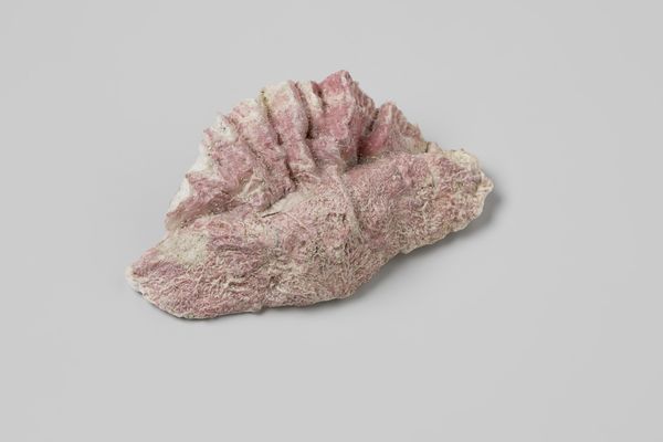 Editor: We’re looking at a shell, thought to possibly be a Bursa rubeta, recovered from the wreck of the Witte Leeuw. It dates from before 1613 and now resides at the Rijksmuseum. The texture is surprisingly complex. It is interesting that a found object is being classified as a sculpture. What do you make of the shape and form? Curator: The power of this piece resides in its materiality. We're presented with a natural object elevated to the status of art. Examine the spiral form; note the way the ridges articulate a sense of growth and dynamism frozen in time. Consider how the texture and pattern give us a tangible sense of the shell's history. Its whiteness is broken by small dark inclusions. What effect do these inclusions have? Editor: They add a sense of age, a feeling of weathering, almost like brushstrokes, actually. Curator: Precisely. These subtle details, along with the pronounced ridges, establish a clear contrast between smooth, flowing lines and jagged edges. The shell also demands a consideration of negative space. The openings and shadows are essential parts of the sculpture. It prompts one to contemplate natural form. How does this object transcend mere representation and evoke a deeper resonance? Editor: Thinking about it only in terms of its lines, shape and space reveals a lot more complexity than initially met the eye! Curator: Agreed. The focus on pure form brings us closer to the sublime inherent in the natural world.