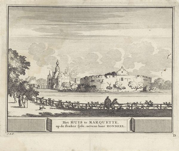 Editor: This etching from 1760, titled "Christiansborg på Guinea-kysten, set fra sydvest," attributed to Michael Rössler, is incredibly detailed. It depicts a coastal scene with a large fort, ships on the water, and what seems to be a settlement. I’m struck by the contrast between the geometric rigidity of the fort and the more organic shapes of the surrounding structures. How would you interpret the formal choices here? Curator: Indeed, the stark juxtaposition in forms is quite compelling. Notice how the fort, defined by straight lines and right angles, dominates the composition, asserting a sense of order and control. The visual language speaks to power. Consider the etcher's mark-making – the tight, controlled lines used to render the fort contrast sharply with the looser, more gestural lines used for the foliage and the cloud formations. What effect does this textural variance create? Editor: I see what you mean. The sharp, precise lines of the fort emphasize its imposing presence, while the looser lines make the surroundings feel more fluid and less defined, creating a sort of visual hierarchy. Curator: Precisely. The formal elements serve to emphasize the distinction between the colonizer's structure and the colonized landscape. It compels us to analyze the binary that the image constructs: order versus nature, control versus freedom, geometric precision versus organic flow. How do you think this contrast affects the overall reading of the image? Editor: I suppose it makes the statement feel more deliberate. It forces me to consider the intentions of the artist, how those decisions may relate to how I understand its subject. Thanks for that insightful deconstruction! Curator: My pleasure. It is through such careful considerations of form that we unravel meaning.