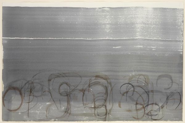 Curator: What we have here is "The Channel Sketchbook 1," a watercolor by J.M.W. Turner, created around 1845. The muted tones give it an almost ethereal quality, don't you think? Editor: Ethereal is one word, I’d say desolate. Look at that band of muddy grey against the pale, sickly pink. It feels like a landscape ravaged by something—industry, perhaps, or just unrelenting weather. We have to remember Turner lived in a period of massive social upheaval related to labor practices. Curator: Absolutely. But observe Turner’s technique—the paper itself, the very substance that receives the pigment, becomes part of the art. This isn't just pigment; it's water, paper, and the deliberate gesture of the artist’s hand enacting industrial landscape and the materiality of it all in a watercolor field sketch. He was obsessed with light and atmosphere; in many ways he prefigured abstraction, all those elements are captured. Editor: I agree it's more than representation. This feels to me like an articulation of vulnerability – of the working classes subject to those destructive economic forces. Those smeared pinks and greys read as a kind of suffering; a collective melancholia of displacement. And the fact it is on paper allows for portability in these messages. Curator: The choice of watercolor, though, shouldn't be overlooked. Its translucence lends itself perfectly to capturing fleeting moments, the impermanence of atmospheric conditions. Consider the availability of this material. Turner chose his material and knew it was key to how his art would develop its meanings. Editor: Precisely, and how that aligns with social structures! Watercolour paintings were also seen as minor artworks, craft. And in Turner's time the establishment saw art as solely for the wealthy ruling classes, Turner captures so much with seemingly so little as his means were inexpensive. That also creates the class distinctions visually and symbolically through production means. Curator: So, Turner offers us, through humble materials, a glimpse into fleeting conditions. Editor: Precisely, and this glimpse functions as a mirror reflecting on class divides in the rapidly industrializing world around him. A somber work when contextualized within the labour conditions of 1845. Curator: Thinking about the physical materials and their manipulation really does unlock a richer understanding of its creation. Editor: Indeed. Analyzing art through multiple critical lenses opens up new avenues for interpretation.