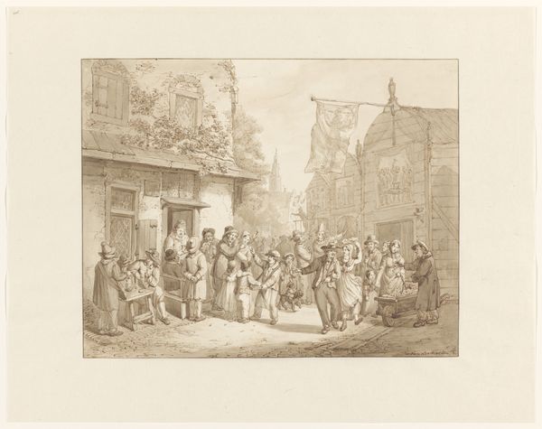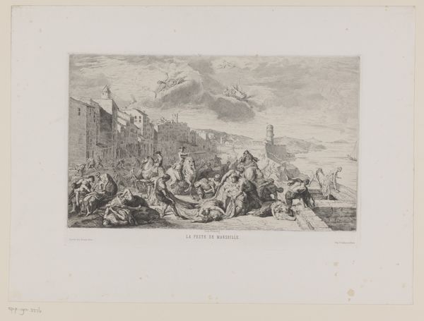 Curator: Here we have Adolphe Mouilleron's engraving from 1852, titled "The Murder of James Stewart, Earl of Moray," currently held at the Rijksmuseum. Editor: It’s bleak, isn't it? A somber realism… almost journalistic. The figures are caught in this terrible, dramatic instant. I feel drawn into the chaos. Curator: Engravings such as these served as visual documentation, especially given the limitations of other visual mediums at the time. The process is painstaking, of course: each line etched into the plate, then printed. Editor: Absolutely. We see class dynamics starkly portrayed. A staged assassination within a tight urban fabric implicates social infrastructures and highlights hierarchies: powerful men on horseback juxtaposed against vulnerable bystanders. It feels performative, with a deliberate manipulation of power. Curator: Considering it’s a print, the detail is quite impressive. Notice the varied textures—the rough stone of the buildings, the fabrics of the clothing—achieved through different line weights and densities. Ink and paper become active components in shaping how we perceive texture and depth. Editor: And the spectators packed onto that raised balcony structure add to the sense of the everyday, ordinary, becoming a spectacle. Who profits politically and socially from Moray’s assassination? This piece screams historical turning points and shifting loyalties. Curator: It really makes you appreciate the skilled labor that went into creating these kinds of images. The planning and execution of such a scene on a metal plate require a deep understanding of materials and their interaction. Editor: Exactly. Mouilleron isn’t merely depicting history, he's implicated in interpreting and representing it through a material and social lens that's far from objective. It encourages a more nuanced interpretation. Curator: Agreed. When we look closely at Mouilleron's materials, we’re encountering more than a depiction of a historical event—it's a narrative embedded in production and dissemination of visual information. Editor: And it makes you wonder, how many other narratives were sidelined or silenced in the process? The visual culture in print became a powerful means to normalize certain power structures, right? Food for thought.
