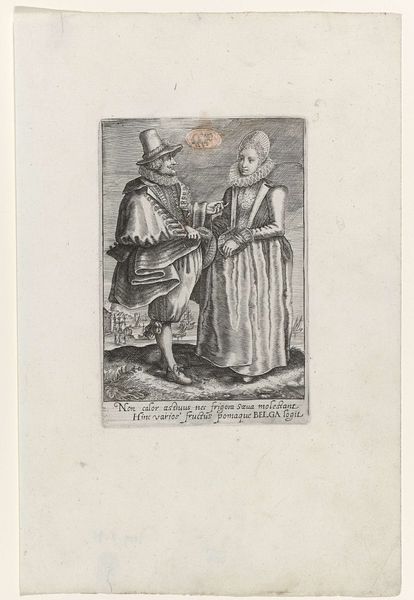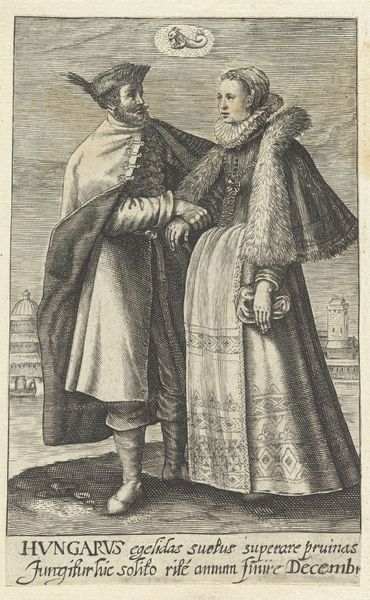 Editor: So, here we have "November: paar uit Oostenrijk" by Crispijn van de Passe II, made sometime between 1604 and 1670. It's a print, an engraving, housed at the Rijksmuseum. The couple in their furs give such a stark feeling...what draws your eye when you look at this piece? Curator: Ah, yes, this isn't just any couple cozying up against the cold, is it? I am drawn to the landscape of clouds looming behind them. The artist captured light reflecting the way emotions shift across faces and hearts. Notice how even Cupid looks cold in the upper left corner—a lovely contradiction. And look at how their hands are held... tentative yet firm. Makes me wonder about their story, doesn't it? Editor: Definitely. It feels like a moment frozen in time, loaded with unspoken feelings. But the text at the bottom – what can we gather from that? Curator: Well, that inscription – “Austria frigidor septemque proquinqua trioni Dar bene respiras mense Nouembre viros” – tells us it’s about Austria in November. Roughly, it speaks of the chill winds and how even then, Austria breathes life into its people. The artist suggests perhaps, something flourishes even in winter, both within this landscape, and their relationship. Is that how it strikes you? Editor: That’s fascinating. I initially focused on the somber mood, but you’ve highlighted the suggestion of hope. It really does change the reading of the piece. Curator: Art, like life, contains multitudes! It whispers, it shouts, it confuses and enlightens, all at once. We just need to listen and let it speak. Editor: Thank you! This engraving is much more nuanced than I had originally considered.