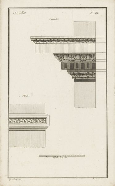 Editor: This is "Ontwerp voor een gebouw met zuilengalerij," or "Design for a Building with a Colonnade" by Bernard Picart, made in 1719. It's a drawing and engraving currently held here at the Rijksmuseum. It feels very architectural, almost cold, but impressive because of its size. How should we interpret this? Curator: From a formalist perspective, it’s crucial to note how Picart manipulates line and form. Consider the rigorous geometric arrangement of the design itself; the print embodies balance and symmetry, hallmarks of classicism evident within the Baroque period. Look closely at the engraving technique – the precision in line weight conveys depth and texture, creating a tangible sense of space despite its being a two-dimensional rendering. Do you observe the systematic repetition of architectural motifs? Editor: Yes, the columns and rectangular panels are hard to miss. They feel very ordered, but how do they contribute to our understanding? Curator: They underscore a concern with rational structure. The repetition acts as a visual language, signifying stability, order, and the ambition inherent in architectural design. This print isn’t merely a representation but also an exploration of aesthetic and structural principles. Note too the stark contrast between the detailed facade and the somewhat abstract floor plan at the base. Editor: So it’s less about the function of the building and more about the artistic rendering itself? Curator: Precisely. We can appreciate the piece by closely attending to its intrinsic visual vocabulary. In that sense it seems as concerned with semiotics and rational language. Editor: That gives me a new perspective on architectural drawings. Thank you for expanding my understanding! Curator: It was my pleasure; a fruitful examination of form indeed.