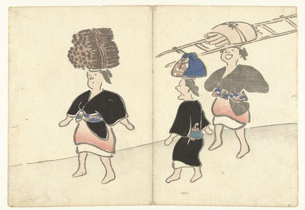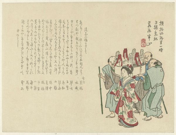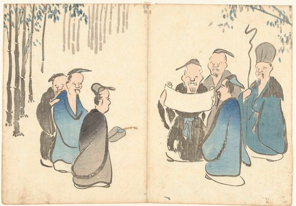 Curator: At first glance, this print bubbles with spontaneous humor! Like a captured moment of theatrical madness, wouldn’t you say? Editor: Indeed. What we’re viewing is a print from 1826 called "Four Musicians and a Noh Dancer" created by Nakamura Hōchū, an artist well-regarded for his Ukiyo-e prints which depicted everyday life and the transient world. Curator: "Transient world" -- How very apt! Because seeing the expressions and movement frozen here gives me a slight melancholy, like grasping smoke. Ukiyo-e... images of the floating world indeed. It feels incredibly alive, then vanished. Editor: In Ukiyo-e tradition, the arrangement carries meaning. The seated musicians, with their instruments – drum, flute, fan, and perhaps a percussion instrument -- could signify their place as cornerstones. The dancer in the front adds an air of dynamism that brings a current of kinetic energy into the tableau. Curator: You mention kinetic energy... Exactly! Despite being a still image, it’s overwhelmingly lively and joyous. The palette might be limited -- muted blues, reds and yellows -- but the energy of performance seems to spill out. Editor: Right, there’s something primal. Each gesture, like the raised arms and opened mouths, speaks volumes across the centuries about joy and community. It echoes across generations to what it means to participate in something collective. And while Ukiyo-e often depicted courtesans and actors, we have working-class entertainment here. Curator: Yes! Not only performers of the time, but they may signify the continuity of theatrical forms. Look how that form remains potent still! This dance is alive even now, as theater and musical symbolism has remained consistent through ages! Editor: Indeed! It serves as a poignant reminder of humanity’s perennial search for entertainment, festivity, and connection. Thank you for providing a fresh outlook into this fantastic Ukiyo-e gem! Curator: The pleasure was all mine! Until next time, enjoy the arts of this world.