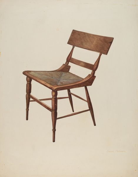 Curator: Welcome. Today, we're observing Margery Parish’s "Chair," a pencil drawing from around 1938. Editor: My initial impression is that it feels…stark. It’s a simple object, but the artist’s close rendering grants it a strange solemnity. The palette feels so restricted. Curator: Precisely! Parish’s work operates through line and tone. Notice how she captures the play of light and shadow on the wooden surface? The texture, almost palpable, reveals the materiality of the subject, bringing forth an appreciation for the humbleness of a chair. Editor: Yet, within that careful realism, I wonder: A chair is not just a chair. Whose body might have sat here? A weary worker? A marginalized homemaker? In the context of the late 1930s, during the Depression, such a mundane subject suggests the struggle of daily life for ordinary people. It resonates with themes of labor and resilience. Curator: A fair point. But structurally, this chair’s design is deceptively complex. See how Parish manipulates the vertical and horizontal planes, creating subtle tensions within the composition? She captures how our minds make order even when seeing such subtle variation of geometric form. Editor: That visual complexity might also mirror the era's anxieties. While seeming simple, it subtly alludes to the disruptions of a world on the brink of war, hinting at the insecurity and instability pervasive at that time. A solid, functional object made vulnerable. Curator: An interesting intersection of the formal and historical analysis! To your point about the instability of this period, there's such elegance in the detail. It shows how something familiar, domestic, is ultimately a rich field for artistry. Editor: Right! Through Parish's simple approach, an unpresuming object can remind us of overlooked realities. That careful choice transforms the way we view ordinary narratives of personhood, memory and being.