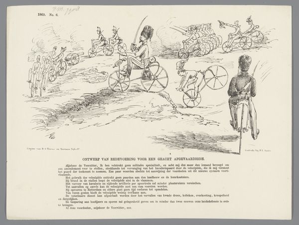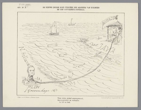 Editor: This ink drawing on paper, titled "Spotprent op het verzet in de Tweede Kamer tegen de begroting, 1885," which translates to "Cartoon on the resistance in the Lower House against the budget, 1885" was created by Johan Michaël Schmidt Crans. It looks like a very critical take on a political issue. What do you see in this piece that helps us understand its cultural and historical context? Curator: Well, immediately, the title gives us a huge clue: "resistance in the Lower House against the budget." The imagery of people struggling to push what seems like an oversized budget up a hill tells us about the fraught political landscape of the time. Do you notice how the artist chose to depict the figures? Editor: Yeah, they seem…caricatured, exaggerated, even? The ones pushing the budget have really strained faces and postures. Then there are these other men on the side. It is confusing. What would an audience at the time of its publication think about this drawing, considering the prominent caricatures and overall visual messaging? Curator: Precisely. The exaggerated features serve a political purpose. Caricatures often rely on shared understandings and inside jokes. And there on the sidelines we see people holding axes or pickaxes. Knowing that would immediately suggest a position, pro or con, regarding this political budget. Considering that it uses very basic imagery, is it aimed at certain audiences? Editor: Perhaps a middle-class or bourgeois audience familiar with current affairs? The artist might be inviting them to critique or question the political process. Seeing this today helps me understand that political art isn't new. Visuals have always played a key role in social commentary. Curator: Absolutely. It makes you think about the function of political satire, even now, doesn’t it? To engage and, hopefully, to hold those in power accountable through accessible visual language. Editor: It definitely does. This artwork opens up a broader perspective on the relationship between political action, the public sphere, and artistic interpretation in 1885. Thanks for making that history so palpable.