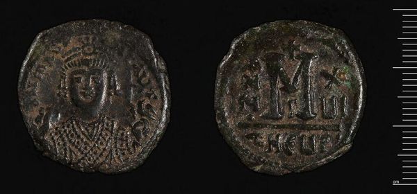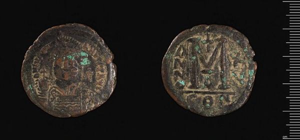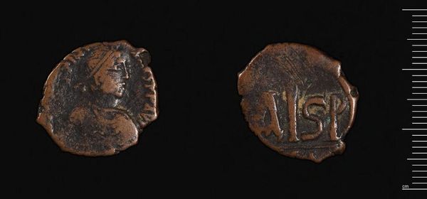 Editor: This is an Anonymous Follis, and it’s at the Harvard Art Museums. Looking at it, I am struck by the texture of the piece and the contrast between the figure and the text. What do you see when you look at this? Curator: Formally, observe the stark contrast. The iconographic elements are clear despite the wear and tear. Consider how the circular shape contains both the figure and the inscription, each demanding equal visual weight. What do these intrinsic qualities suggest to you? Editor: I see balance, perhaps, despite the asymmetry created by the wear. Curator: Precisely. It is in the tension between the intended form and its current state that we grasp its complexity. It invites us to reflect on time, use, and inherent value. Editor: Thank you. I’ll definitely look closer at the shape and wear next time.