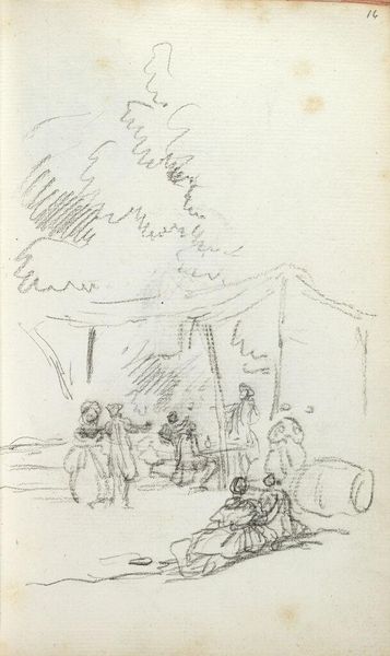 Editor: Denman Waldo Ross's pencil sketch, "Market Scene, Biskra, Algeria," feels like a fleeting glimpse into a bustling place. What cultural stories do you think are captured in this almost dreamlike composition? Curator: The image echoes the visual tropes of Orientalism, yet lacks its typical romanticism. Do you see how the artist avoids strong detail, presenting figures anonymously, almost as types? This creates a universal, rather than specific, narrative. Editor: I see what you mean! So the sketch emphasizes a collective cultural memory of a North African market, rather than any individual experience. Curator: Precisely. The ambiguity invites us to project our own associations onto the scene. Considering that, what meanings resonate most with you? Editor: It highlights the power of suggestion in art. Thanks, I appreciate how this connects to the larger cultural landscape. Curator: Likewise. It's fascinating to consider how sketches, even seemingly simple ones, can carry significant cultural weight.