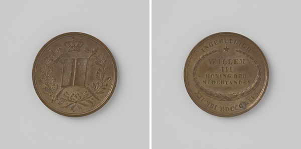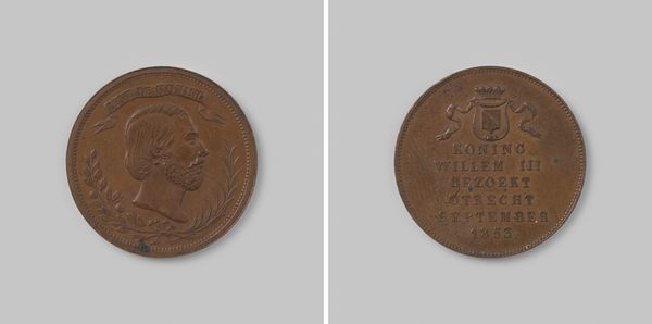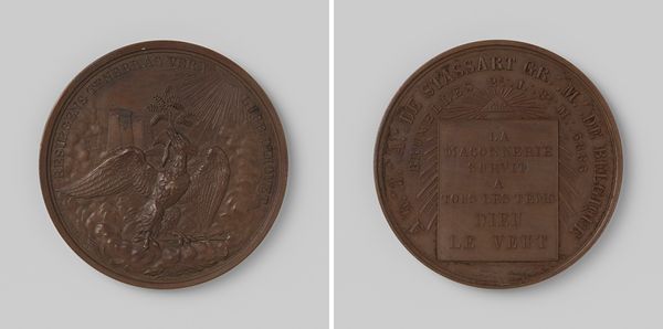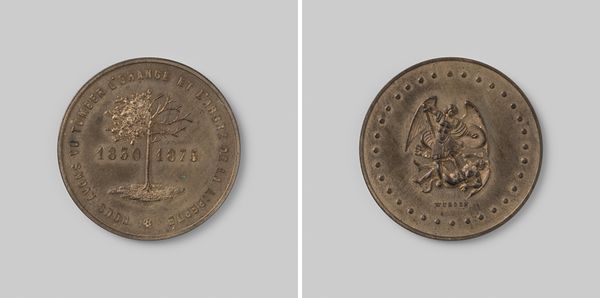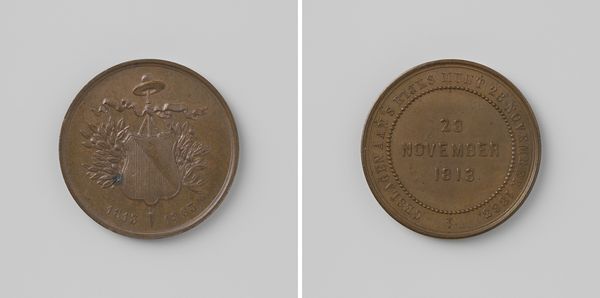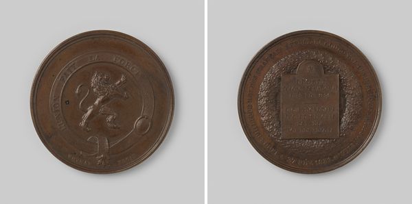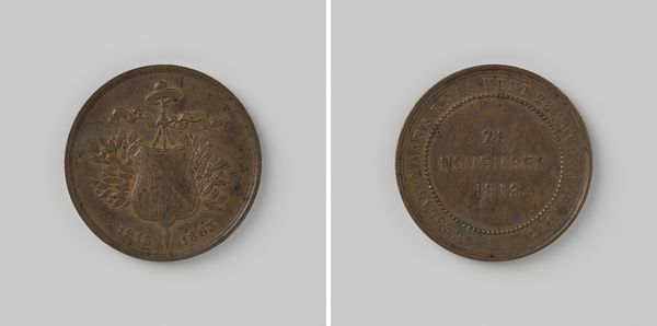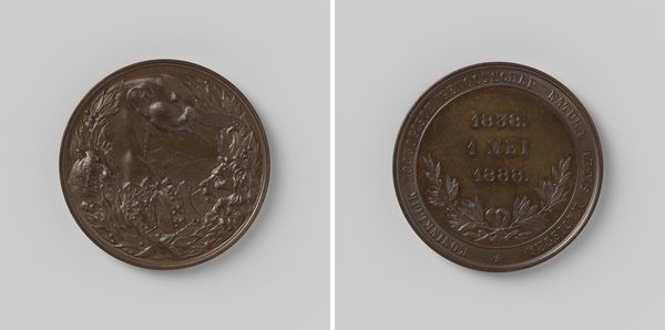 Editor: This bronze relief, titled "Vijftigjarige viering van kozakjesdag: herdenking van het binnentrekken van de kozakken te Utrecht," was created anonymously in 1863. I'm immediately struck by its texture and the contrast between the smooth, flat surface and the raised, almost sculptural details. What can you tell me about this commemorative piece? Curator: From a materialist perspective, this piece prompts several questions about its creation and consumption. Bronze, a durable and relatively inexpensive metal, was likely chosen for mass production. Considering this was produced by the Rijksmunt (the Dutch Mint), understanding the socio-economic context surrounding its commission is crucial. Were these medals widely circulated among the populace or reserved for specific elites? How does this mass production speak to a developing sense of national identity? Editor: That’s a fascinating point about the economics. I hadn't considered the social implications of mass production for commemorative items like this. The date also places this just before some key changes within Europe and, indeed, within the Netherlands. It does make you think about who it was made for, and by whom. Was the labour division related to this item one that required great skill, or could it have been done by lesser-skilled factory workers? Curator: Exactly. Further research into the minting process of the 1860s would be illuminating. The materiality of the medal is inherently linked to its message. The bronze, although lasting, is humble, when compared with gold, or even silver, but can reach more citizens, but does this cheapen the message that it hopes to send about military strength and power? Editor: I guess it all feeds into the socio-economic structure. And seeing an item such as this pushes you to research this connection between materials, process and that social background. Thanks, that was really interesting! Curator: Likewise. Thinking about the metal and method offers interesting perspective on art history.