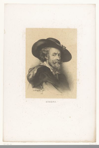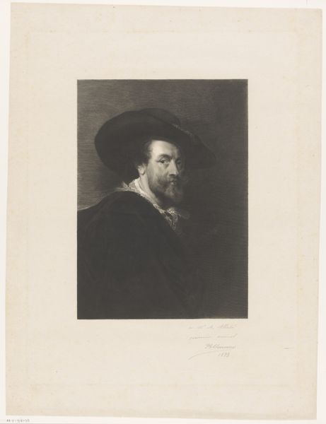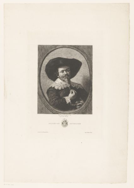 This print, titled "Man met hoed en drinkglas," was created by Charles Théodore Bernier, who lived from 1871 to 1950. It’s a great example of the etching process, where an image is drawn into a wax ground on a metal plate and then acid-etched, creating recessed lines that hold ink. The print you see results from wiping the plate clean, leaving ink only in the etched lines, before pressing it onto paper. Notice how the etched lines give the image its distinctive texture and tonality. Bernier likely used different tools to vary the depth and width of these lines, creating highlights and shadows that suggest the folds of the sitter's ruffled collar, and the weight of his hat. Prints like this reflect a wider social context, too. They made art more accessible than unique paintings, circulating images and ideas to a broader audience. The labor involved – from the artisan who prepared the plate to the printer who ran off each impression – is a reminder that art is always a product of collective work. So, as you look at this image, consider the way the materials and making contribute to its meaning, blurring traditional lines between fine art and craft.