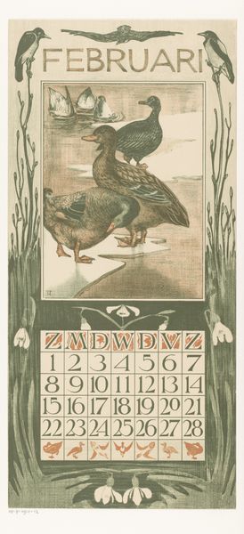 This calendar from December by Theo van Hoytema presents a rich array of symbolic imagery. Note the proud rooster, a traditional symbol of dawn, vigilance, and even arrogance, set against a backdrop of holly, which has long signified protection and immortality, especially during the winter solstice. The rooster’s symbolism is not limited to this era; across cultures, from ancient Rome to the medieval period, the rooster’s image has been used to evoke courage and resurrection. Consider the placement of the crows at the bottom of the calendar. They seem to guard time itself. Crows have often been associated with mystery, prophecy, and transformation. Much like the cyclical nature of time, the crow undergoes its own transformations in folklore, sometimes appearing as a harbinger of doom, and other times as a guide between worlds. The emotional undercurrent here is palpable—the stark contrast between the rooster's vitality and the crows' somber presence creates a tension, reflecting the mixed feelings often associated with the year's end.