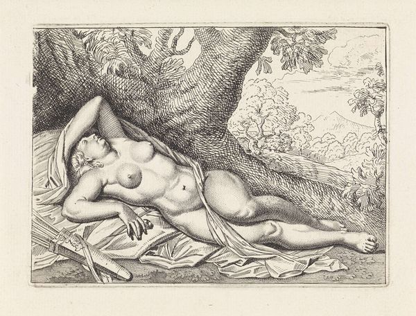 This is Laurent de La Hyre’s "Diana Recumbent," an etching made in the mid-17th century. The process of etching involves drawing a design with a sharp needle through a wax coating on a metal plate, which is then bathed in acid. The acid bites into the exposed metal, creating recessed lines that hold ink. Here, La Hyre uses line to describe the smooth volumes of Diana’s reclining body, her drapery, and the surrounding landscape. Notice how he varies the density and direction of the lines to create tone and texture. The labor-intensive process of etching allowed artists like La Hyre to produce multiple copies of their work, which were then sold to a wider audience. Prints like this one played a crucial role in the dissemination of artistic ideas and styles during the early modern period. In this way, it encapsulates the early stirrings of a modern art market, where the hand-made is mediated through a reproducible technology. So, think about how the material process of etching affected not only the appearance of the image, but its social life as well.
