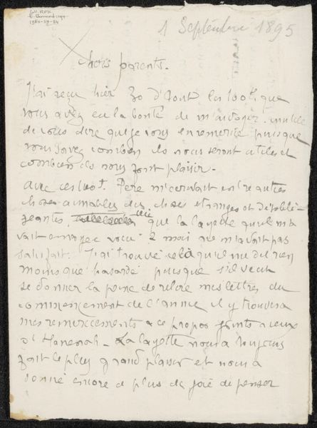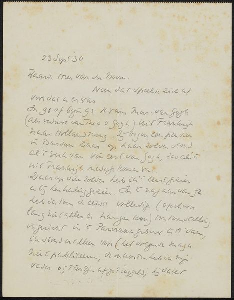 This is Emile Bernard’s handwritten letter "Brief aan Héloïse Bernard-Bodin" from 1894. The overall impression is one of intimacy combined with visible emotion. The page is filled edge to edge with cursive script, the writing dense, immediate and personal. Look closely, and you'll notice the way the words crowd each other, some tilting this way and that as if compelled by the urgency of the message. The letter is not just a means of communication but also an artifact that captures the artist’s emotional state. The lack of carefully ruled lines gives the impression of a mind pouring its thoughts onto the page without restraint. Consider how the visible corrections—the scratched-out words, the ink blots—reveal the writer's process. These are not imperfections but integral parts of the letter’s meaning, showing us the unedited thoughts and feelings of Bernard as he grapples with loss and despair. The letter is not just about its content but also about the act of writing itself, a form of emotional expression through the physical traces left on the page.