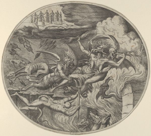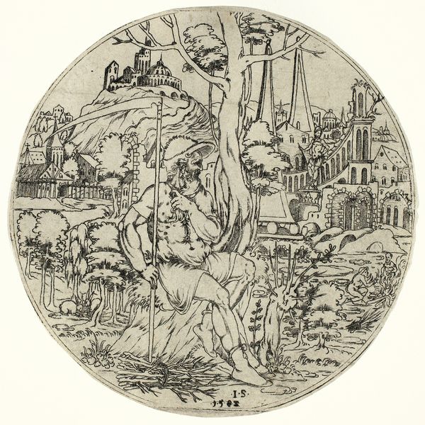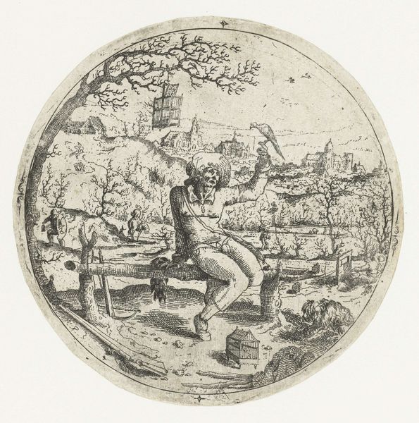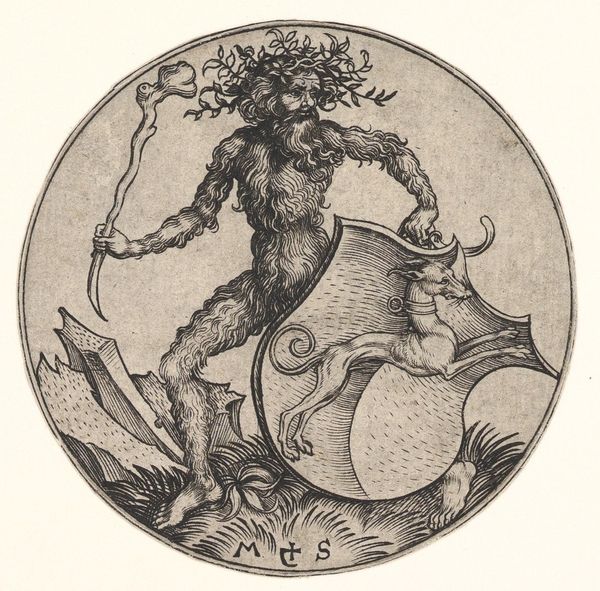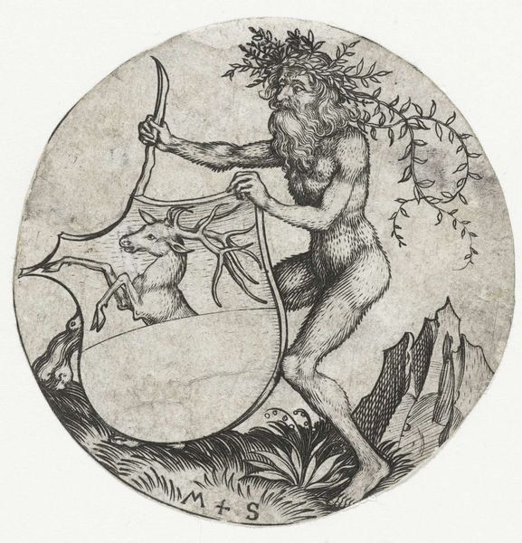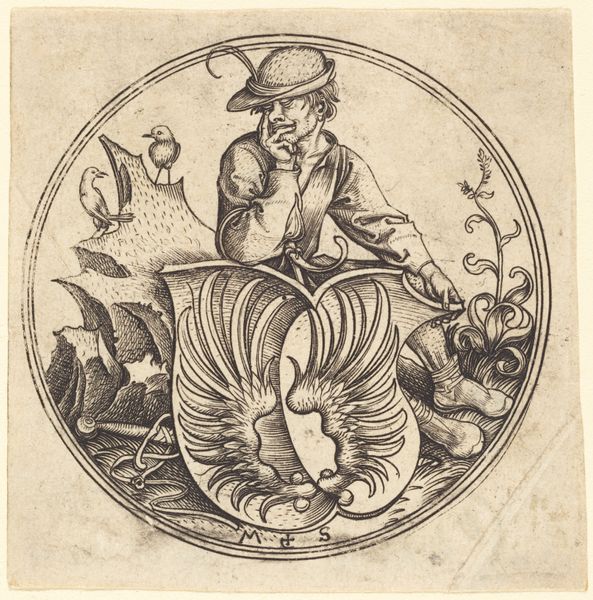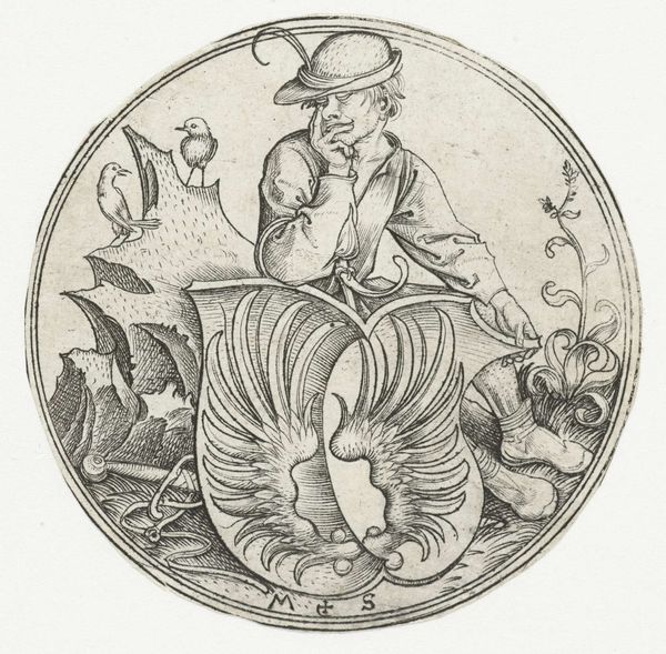 Editor: So, here we have Wenzel von Olmutz's "Wapenschild met vleugels, vastgehouden door een boer," an engraving from around 1481 to 1497. It feels strangely whimsical, yet melancholic at the same time. What springs to mind when you look at it? Curator: It's a little visual puzzle, isn't it? What captivates me is the contrast. You have this rugged peasant, a man of the earth, almost comically burdened by this ornate, winged coat-of-arms. Is he daydreaming about soaring above his station? Or maybe he feels crushed by the weight of it? And those little birds perched nearby! Are they mocking his grounded state, or whispering secrets of liberation? Editor: I like that image of him daydreaming about soaring! But the birds, I hadn’t considered them symbolically. Curator: Think about it – a symbol of freedom against a symbol of status. Maybe it’s about the yearning for escape, for something more than one’s lot in life. Consider, though: how much agency did people of his station actually possess in shaping those dreams? Were those his dreams at all? Or borrowed finery? Editor: That’s… sobering. And the shield itself, does it offer any clues? The eagle-like creature feels quite powerful. Curator: It certainly projects authority. But nestled within the earthy scene… the power feels tempered, domesticated even. Perhaps von Olmutz is subtly critiquing the power structures of his time, revealing their disconnect from the realities of everyday life. Almost like those absurd Renaissance festivals that aristocrats so enjoyed. Editor: So, the humor undercuts the grandeur? Curator: Precisely! Art, even in print form, wasn’t just about displaying power, sometimes it cleverly, subtly, questioned it too. Did artists need that in that age, perhaps in our age today? I think perhaps… Editor: I see it differently now! The weight of those wings is both literal and symbolic. Curator: Exactly! The genius is in the tension – between aspiration and reality, freedom and constraint. Makes you think, doesn’t it? And isn't that the best kind of art?
