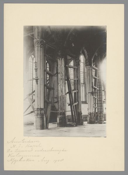 Curator: Albert Adriaansz's 1908 photograph, "Interior of the Nieuwezijds Chapel in Amsterdam," presents a haunting view. The geometric starkness of the architecture, especially the imposing columns, is really striking. Editor: It’s immediately evocative, isn’t it? There's an emptiness, an almost ghostly quality conveyed through the photographic medium, with its soft focus. It suggests a building stripped bare, ready for redevelopment maybe? I am keen to explore more the way the light plays on the different materials used, and to imagine who made these impressive architectural forms. Curator: Well, the Neuezijds Chapel had a complex history, originally a Catholic place of worship and then becoming protestant during the reformation, mirroring Amsterdam's own religious upheavals, before finally ceasing operations in the 1950s. The photograph might reflect some of that shifting identity, showing a space in transition. Editor: It does make you consider the physical labor required to create these vast structures, not to mention the cost. Churches always represent the intersection of social forces and material excess. Looking closer at the construction, how would the wood rafters have been hewn, raised into place? How long did each stone column take to carve and polish? Curator: Considering gender too: What roles were open to women here, beyond simply being a place for reflection? Who held authority, dictated designs, financed building? Editor: Absolutely, we could see it through lens of materiality: stone, timber, plaster all mined and processed with varying degrees of craftsmanship, connecting it to a global web of resource extraction. And what was left, for later generations when its utility ended? Waste and reclamation, as an act of either respecting its value or completely demeaning its original intention. Curator: This tension is palpable. And it provokes the questions: Whose story is enshrined in spaces like these, and what narrative will we inherit? Editor: Precisely! Even something as seemingly static as a photograph opens to many avenues for reflection, doesn’t it? Looking carefully reminds us that meaning inheres not just in the what but how something is made, and what interests had to be met in the process.