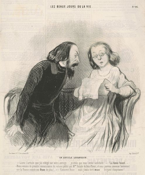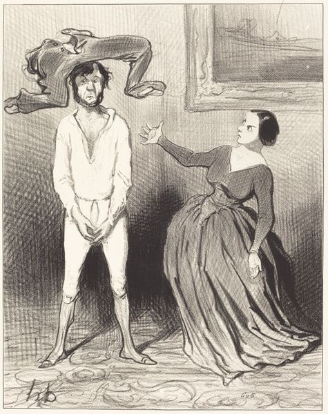 This image is an undated lithograph by Honoré Daumier, a French printmaker, caricaturist, painter, and sculptor, whose work offers commentary on social and political life in 19th-century France. In this piece, which translates to "Conjugal Manners," Daumier turns his critical eye toward domestic life, highlighting the tensions within marriage. The wife confronts her husband, holding out a strand of hair she found on his vest. His flustered response references his “collecting of curiosities” that he bought at auction and claims, “it comes from Cleopatra!” Daumier captures the power dynamics inherent in gender roles of his time, in which men possessed greater social and economic power and women had little recourse against male infidelity. Through caricature, Daumier critiques the societal norms that allowed such imbalances to persist, inviting viewers to consider the emotional toll of these power dynamics on both men and women. Though this lithograph depicts a specific time, it evokes questions that continue to resonate about identity, fidelity, and societal expectations in modern relationships.