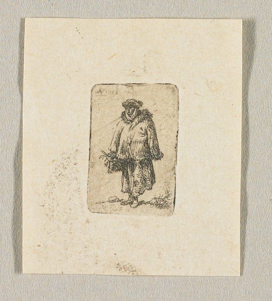 Curator: This diminutive figure before us is titled "Rådmand Secher," a print by H.P. Hansen, dating back to sometime between 1829 and 1899. Editor: Well, right away, he strikes me as self-important, a bit puffed up despite his small size. The tiny, precise engraving only exaggerates this, almost as a cartoon. Curator: Indeed. The image leans heavily into caricature, magnifying physical features to humorous effect, which was quite a popular tool in portraiture and prints of this time. Note how Hansen plays with scale here. The man's headwear and belly suggest ambition, position, perhaps the trappings of bourgeois life. Editor: You can certainly see how such imagery served socio-political critique. Visual strategies like disproportion became weapons— leveling against authority and challenging idealized representation, democratizing art for the masses. Caricature strips away any assumed mystique. Curator: Precisely. Through exaggeration, a cultural narrative takes shape. Consider the power dynamic encoded here. Was Hansen satirizing the Rådmand Secher, mocking his self-importance or actual policies? The artist's commentary imprints into public memory via the reproduction process and wide circulation of the engraving. It serves as potent reminder of political satire as social commentary. Editor: The seemingly innocent image transforms from simply 'a portrait' into documentation of public sentiment during an era, immortalizing a particular, critical viewpoint, and that says as much about the artist as it does about the councilman himself, wouldn’t you agree? Curator: Undoubtedly. This miniature satirical study reflects broader political themes relevant to print and civic portraiture of the time. Editor: I'll leave this encounter pondering the true face and legacy behind "Rådmand Secher." Curator: As I find myself marveling at how lasting the impressions created with ink on paper can really be.