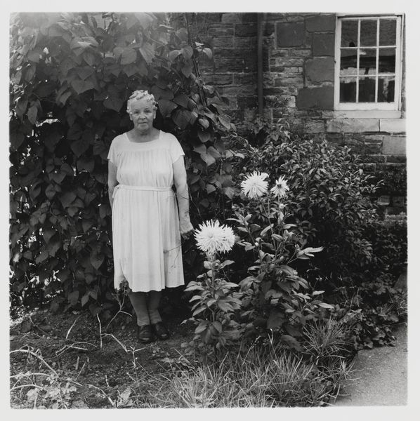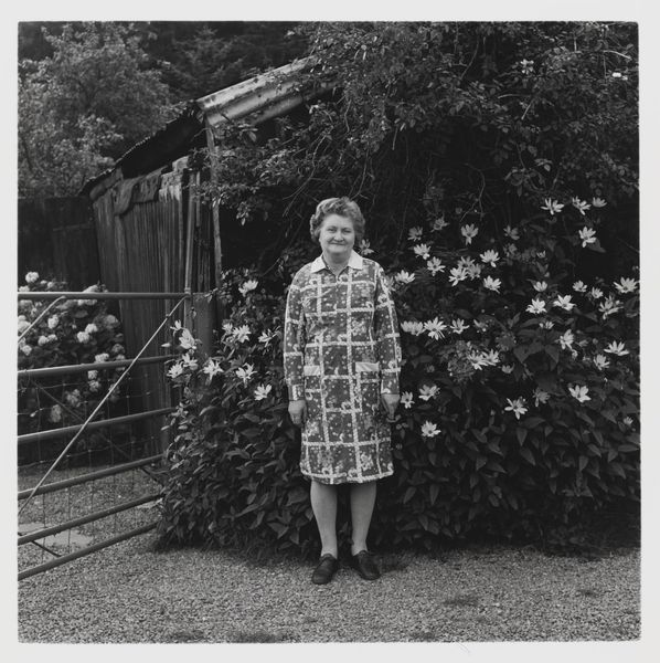 Editor: This is Keith Arnatt’s "Gardeners" from around 1972, a black and white photograph. The subject is an unassuming woman standing in her garden. It feels very… ordinary. What do you see in this piece? Curator: Ordinary, yes, but Arnatt's work often explores the unacknowledged labor and hidden narratives of everyday life. How does the positioning of the woman, centered and almost confrontational, challenge societal expectations of women's roles in the 1970s? Editor: I hadn't thought about that. It's like he's making her visible, giving importance to the mundane. Curator: Exactly! And consider the political implications – is Arnatt suggesting that the domestic sphere holds its own form of power and resistance? It’s about challenging the male gaze. Editor: So, it's not just a photo of a woman in her garden; it's a statement about gender and class, seen through the lens of the everyday. Curator: Precisely. Art finds power in the places we least expect.