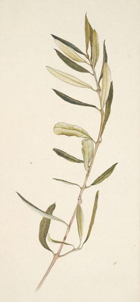 Curator: This is a watercolor by Charles Herbert, titled "Branch of Rhododendron," and while we don't have an exact date for its creation, Herbert was born in 1829. Editor: Oh, it's lovely. Quiet, almost spectral. The leaves have this silvery-grey wash, it feels like a memory of spring. Curator: It's interesting you say that, as botanical studies like this were often commissioned by wealthy patrons to document rare specimens and also served as a status symbol of sorts. Editor: So, a little like showing off your prize-winning rose at the county fair. Still, there's something so delicate in Herbert’s touch. He really captured the fragility of the plant. Curator: Indeed, and it is worth noting the verso contains architectural studies which hints towards the artist's range of interests. Editor: It's fascinating to think what else he might have seen, what other worlds existed for him on a day to day. Curator: A glimpse into a different era, indeed.