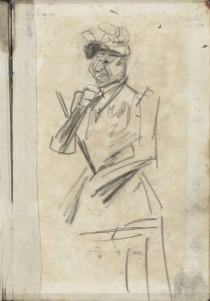 Curator: This pencil drawing is entitled "Nikolaos Troupakis, Senior Commander," created in 1913 by Thalia Flora-Karavia. It presents a three-quarter view of a military figure against a stark background. The quickness of the work makes the overall scene feel somehow unresolved to me. Editor: There’s a certain immediacy to it, I agree. You can practically feel the artist’s hand at work. Look at the paper itself, its color and texture–almost like it was whatever was immediately available. I’m interested in the materiality, the simplicity of pencil on paper. Curator: Absolutely. Let's contextualize this a bit further. Flora-Karavia, a Greek artist, was capturing a powerful figure at a pivotal moment. The Balkan Wars were raging; there was an atmosphere charged with nationalism. How might this inform the subject of Nikolaos Troupakis and his representation? Editor: I see this in terms of production – what does it mean to rapidly sketch a commander during wartime? The use of such humble materials brings a down-to-earth humanity to what could be just another monumentalized portrait. It's the making, the quick marks, the access to the drawing, and what it evokes. It challenges hierarchies. Curator: Yes, and the “humble materials,” as you call them, contribute to an interesting tension. On the one hand, it's a study of a commander, representative of authority and order. Yet, the medium subverts any potential for grandiose presentation. This intersection becomes even more potent when one remembers the artist was a woman, navigating a deeply patriarchal society amidst war and conflict. What perspectives might she bring to depicting a man in power? Editor: A lot of meaning is interwoven in what at first seems simple. The drawing isn't detached or "high art;" it is utilitarian. This can be read, as you suggest, as a subversive act against traditional representations of power, through a conscious deployment of tools available to her within a specific economic and historical context. Curator: Reflecting on the social environment that informed Flora-Karavia's hand allows us a critical insight into the convergence of identity, war, and artistic representation in 1913 Greece. Editor: Indeed, this approach enables us to analyze not just the representation of Nikolaos Troupakis, but the artistic labour and means of its realization, grounding it in tangible elements.
