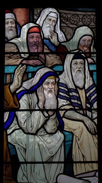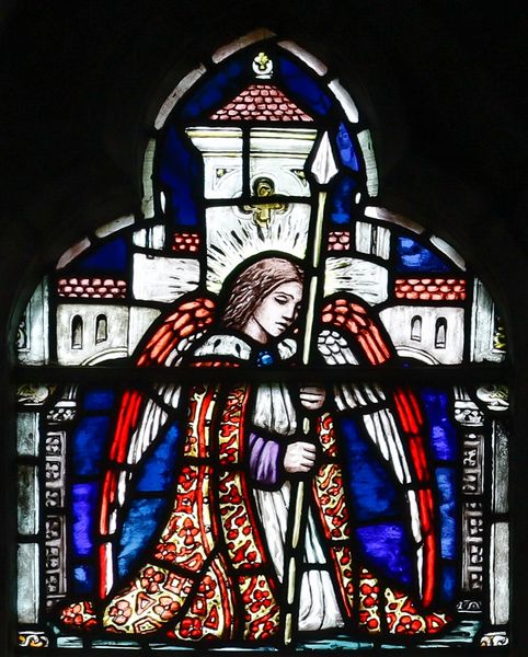 Curator: This stained glass detail is by Ludovic Alleaume, completed in 1919, depicting "Jesus and the Samaritan woman" at the Église Saint-Sulpice de Fougères. The pale luminescence radiating from Jesus immediately captures attention. What are your initial thoughts? Editor: Well, it’s clearly striking—the lead lines holding the glass together create this almost brutal geometric scaffolding. It clashes strangely with the subject, almost imprisoning it. The materials feel heavy. Curator: Absolutely. The leadlines do serve a practical structural function, but here they amplify the narrative. Consider how Alleaume has employed medieval archetypes; this scene, rich in symbolic meaning, focuses on Jesus’s spiritual authority, even over established social norms. Editor: So, even in the early 20th century, artists were returning to pre-industrial forms and subjects. What did engagement of artists like Alleaume mean at the time it was made in the wake of a conflict that relied so completely on modern manufacturing? Curator: That’s insightful. This glass functions as more than simple decoration; it represents faith in the face of modernity’s disruptive forces. The return to figuration connects the viewers to historical and spiritual values. Notice the subtle palette-- blues, reds, pale ambers – it evokes serenity. Editor: Yes, but it's a restrained palette; almost muted compared to, say, Chartres. Look closely— the texture in Christ’s robe almost resembles hammered metal. This panel then isn’t simply about piety, but it’s very self-aware about its process. Curator: Indeed. Alleaume, masterfully using the medium's constraints to express both divine presence and human connection. We've witnessed the enduring power of symbolic visuality and the tangible impact of its construction. Editor: Ultimately it showcases the enduring nature of artistic innovation—both through symbol and stuff.