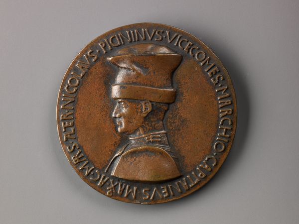 Savelli Sperandio created this bronze medal of Federigo da Montefeltro, Duke of Urbino, in the 15th century. It is designed as a flat circle with inscribed lettering around the edge. The bronze material gives it a solid and enduring presence, reflecting the Duke’s authority and power. At the center is a profile of Federigo, his features sharply defined. The lines are clean and precise, capturing the detail of his face, from the determined set of his jaw to the cut of his hat and armor. The Duke's gaze is directed towards the future, suggesting progress. His attire is depicted with careful attention to texture and form. The lettering around the edge is carefully inscribed and creates a frame that encloses the Duke. This medal is an object of visual communication that uses symbolic elements to express ideas about leadership and Renaissance values. This isn't just a portrait; it's a carefully constructed statement about identity, power, and cultural ideals. The enduring quality of bronze ensures that it speaks to us even now.