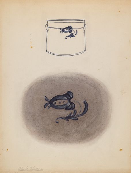 Editor: We're looking at "Crock," a drawing in ink by John Tarantino from around 1940. The subject is a ceramic crock, and the artist used decorative elements on it, like the blue jay. There is something so charming in its simplicity. What formal elements stand out to you in this piece? Curator: Immediately, I’m struck by the economy of line. Note how Tarantino establishes form and depth using primarily contour lines and strategic areas of filled-in ink wash. There's a considered balance between positive and negative space. The subject is clearly represented but its stylized application, notably in the representation of the blue jay, demonstrates an exploration of pure form. The question becomes, what do these distilled forms convey beyond mere representation? Editor: So it’s about what he leaves *out* as much as what he includes. I hadn't considered the empty space as actively contributing. Curator: Precisely. The negative space allows the eye to complete the forms and appreciate the isolated composition. Furthermore, the blue ink isn't merely descriptive; it contributes to the artwork's overall structure, modulating tonality to generate depth within the limited chromatic scale. What is the relationship, therefore, between these visual choices and their possible implications? Editor: I suppose it asks us to consider the *essence* of a crock and the decoration rather than its real world application. The very simplification makes it art. I was focusing so much on *what* it was; I forgot to look at *how* it was made. Curator: And through understanding 'how', the essence is revealed, leading us closer to a greater understanding of art itself.