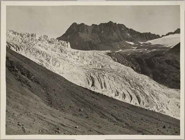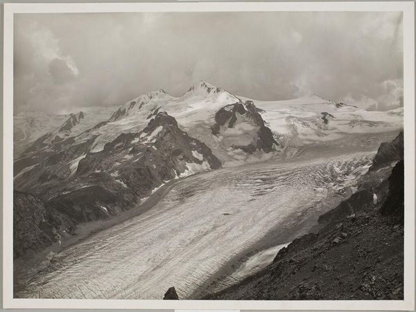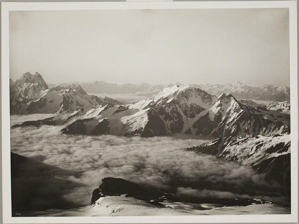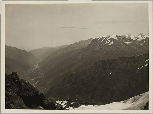 Editor: So, this is William Henry Jackson's photograph of the Saguache Range from Mt. Ouray. It's a monochrome print, and honestly, it feels so vast and a bit desolate. What do you see in this piece that I might be missing? Curator: Ah, it's interesting you say desolate. I see a serene kind of stillness, a moment captured before the rush of development. Jackson wasn't just documenting; he was shaping a vision of the American West. Do you feel the weight of exploration in this scene? Editor: I guess I do, now that you mention it. It does feel like a frontier. Curator: Exactly! It’s a landscape that invites us to dream, a reminder of what was and a question about what could be. Editor: I hadn't considered it that way. Thanks for opening my eyes. Curator: My pleasure. It’s always a journey of discovery, isn’t it?