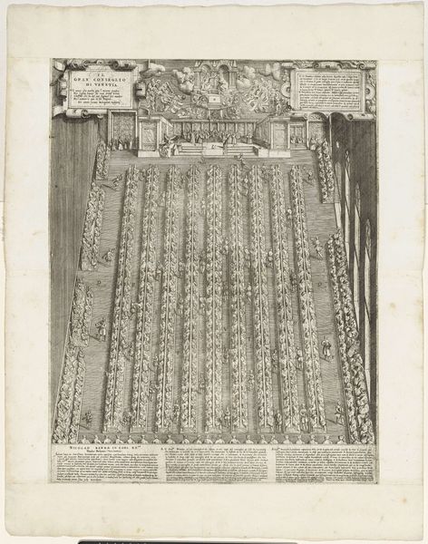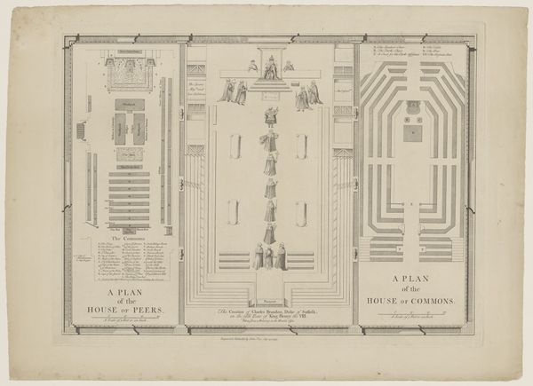Editor: So, this is Cornelis Bogerts' "Interior and plan of the Gasthuis Church in Amsterdam," from 1774. It’s a print, an engraving. It feels almost…clinical, like an architectural diagram. What do you make of it? Curator: Indeed. The eye is immediately drawn to the detailed rendering, but consider the symbolism embedded within this almost "clinical" approach. Observe how perspective, a hallmark of the age, is used not merely to depict space, but to project a certain order, a rationalization of the sacred. Notice how this relates to shifts in societal thought, where reason begins to challenge traditional religious iconography. Editor: I see what you mean. The symmetry, the almost obsessive detail in the seating plan…it's like a map of the congregation. Curator: Precisely. This is not just a depiction of a physical space but also a representation of social space. How does the placement of the statue of Saint Peter—the keys to the kingdom—figure into this arrangement? Consider how these symbols, combined with the floor plan, would communicate power dynamics to viewers of the time. Do these features convey control? Reverence? Community? Editor: Well, seeing the individual seats laid out like that does make it seem more about control. Almost bureaucratic. The Saint Peter statue feels a little… isolated? Curator: Isolation, in a house of God? The image seems to express that isolation—a reflection of the changing relationship between the individual and organized religion. How are you reading these visual cues now, regarding societal structures? Editor: Now I see the piece isn't just about architecture. It’s using symbols to show this whole societal shift. That's so much more interesting than just a drawing of a building. Curator: The power of an image lies not merely in its representation, but in its enduring capacity to echo cultural memory, and provoke reflection across generations.