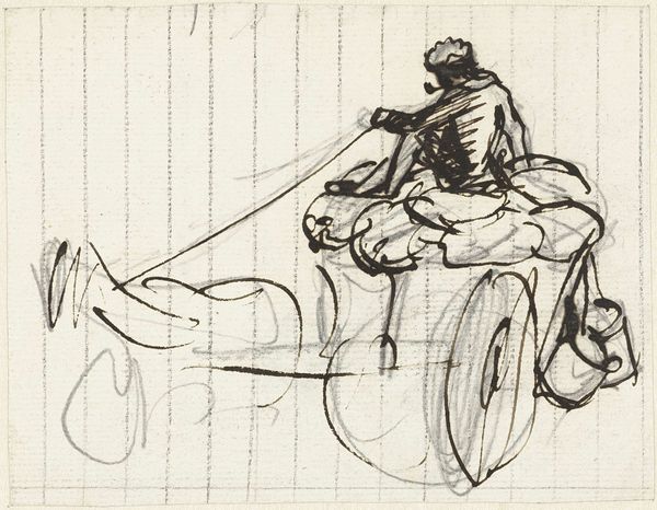 Curator: Jean-Louis Forain created this pencil drawing titled "Refugees II" around 1914 to 1919. Editor: The sketch-like quality immediately conveys a sense of transience, almost like capturing a fleeting moment of hardship. Curator: It’s the First World War period, and we should remember Forain was deeply affected. Consider how quickly he was able to execute it. Pencil on paper suggests both the urgency and accessibility of expressing what was unfolding at the time, mass displacement. Editor: The image of the mother, head bowed, leading the cart… she carries the weight of collective sorrow. Her clothing obscures her form, dehumanizing and representative of so many women in that era of turmoil. It’s interesting that Forain decided not to emphasize the particular or anecdotal aspects of this experience. Curator: He's highlighting labor, a working class of women doing the grunt work. It prompts consideration of the socioeconomic disruptions caused by war; new supply chains are needed, work needs re-organizing and all whilst mass dispossession ensues. He is speaking to both emotional suffering and also how resources were rapidly depleted. Editor: I see symbols of the collective trauma endured by those displaced during conflict. The covered heads suggest grief, the blurred figures imply their anonymity, but it does bring a universality. We see the individual within a collective crisis, a poignant emblem that evokes human empathy. Curator: Yes, but let’s also think about the production, these were mass-produced drawings intended for public consumption as journalistic illustration. It served a function for propaganda and perhaps even fund raising at the time. Editor: Perhaps we can both agree the artwork powerfully captures the essence of displacement, speaking to shared human experiences during conflict with lasting relevance. Curator: Ultimately, it leaves one with many questions. An artwork functioning both as propaganda yet evoking a human reaction to events. What better testament to the complicated status of an image than this?