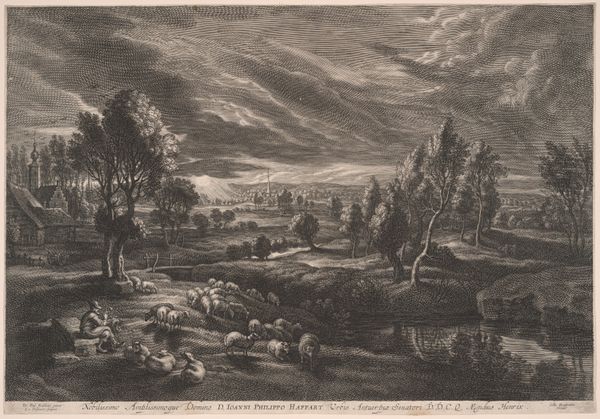 Curator: What a remarkably evocative image. This is Louise Ravn-Hansen’s etching "Blæst og regn," created in 1898. The work is currently held at the SMK, the Statens Museum for Kunst. Editor: Yes, the title, "Wind and Rain," is immediately fitting. It captures that wildness perfectly. It’s not romantic in the traditional sense but speaks more of harsh, persistent conditions and an almost lonely scene by the sea. Curator: The lone building nestled inland and rows of trees are particularly compelling. Sheltering or protected. Do you see some link with similar iconic representations from that time period? Editor: Absolutely. While impressionistic in style, there's also this underlying stark realism in its depiction of the landscape, its unforgiving aspects. The almost oppressive weather adds to the notion of people living in constant negotiation with their surrounding. There’s commentary on resilience here. The building surviving these conditions almost becomes a symbol for humanity. Curator: Or perhaps of home itself. The thatched roof feels almost primal. The way Ravn-Hansen uses line etching is masterful, almost chaotic in the sky and sea and detailed in the calmer right third. How does the composition guide your interpretation? Editor: The chaotic cross hatching contrasts so fiercely with the ordered lines near the trees; maybe its more than just order but imposed control vs the forces of nature. How our need to dominate nature ends up making something much more brutal than anything weather could conjure. This could symbolize both an actual storm and the socio-political climate she existed in. It gives a commentary on how marginalized people survive it all. Curator: That's such a thought-provoking observation, casting a new light on the imagery and symbolic language employed by the artist. Considering this interplay enriches our understanding. Editor: It does, doesn't it? Seeing beyond the pure aesthetic and locating the work in social, feminist, and intersectional perspectives. These readings add layers and urgency to the artwork. Thanks! Curator: The pleasure was all mine! The ability of art to speak to multiple audiences over time, across varying contexts, reveals something powerful.