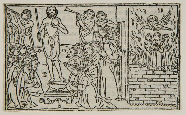 Curator: This is Illustration LIV, an anonymous work currently residing at the Harvard Art Museums. Editor: It feels like peering into a secret world, with all its codes and rituals laid bare in stark lines. Curator: The imagery here probably reflects a specific cultural or religious practice. Notice the figure behind bars, seemingly engaged in scholarship or writing. Editor: That confinement, juxtaposed with the outdoor scene... is that a reference to inner wisdom versus the distractions of the external world? I see symbols of knowledge and transmission everywhere. Curator: It raises intriguing questions about the roles of scholars, scribes, and perhaps even prisoners within the society that produced this image. Who had access to knowledge? Who controlled it? Editor: The arrangement of figures certainly suggests a hierarchy of some sort, and the book or scroll appears central to whatever is unfolding here. Curator: It's a powerful reminder that even seemingly simple images can open up vast historical and symbolic landscapes. Editor: A fascinating piece, indeed—it makes you wonder about the stories that remain hidden within its lines.